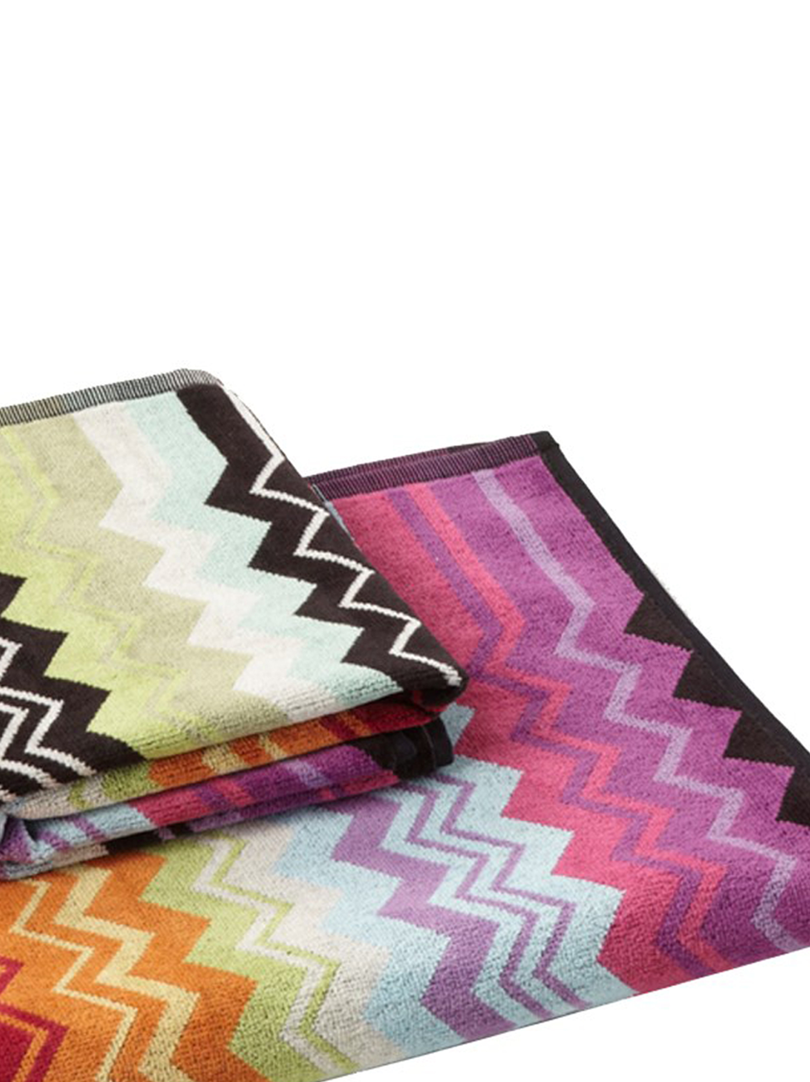 Set of 2 multicolor zigzag velour terry cotton towels. ‘Riccio’ terrycloth back. Consisting of a guest towel and a towel.