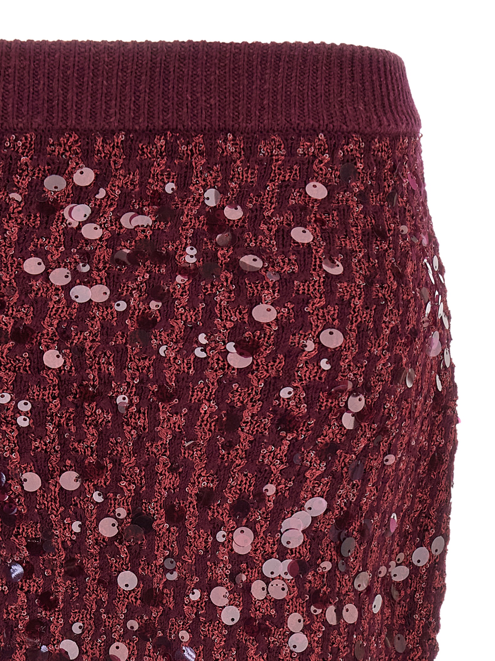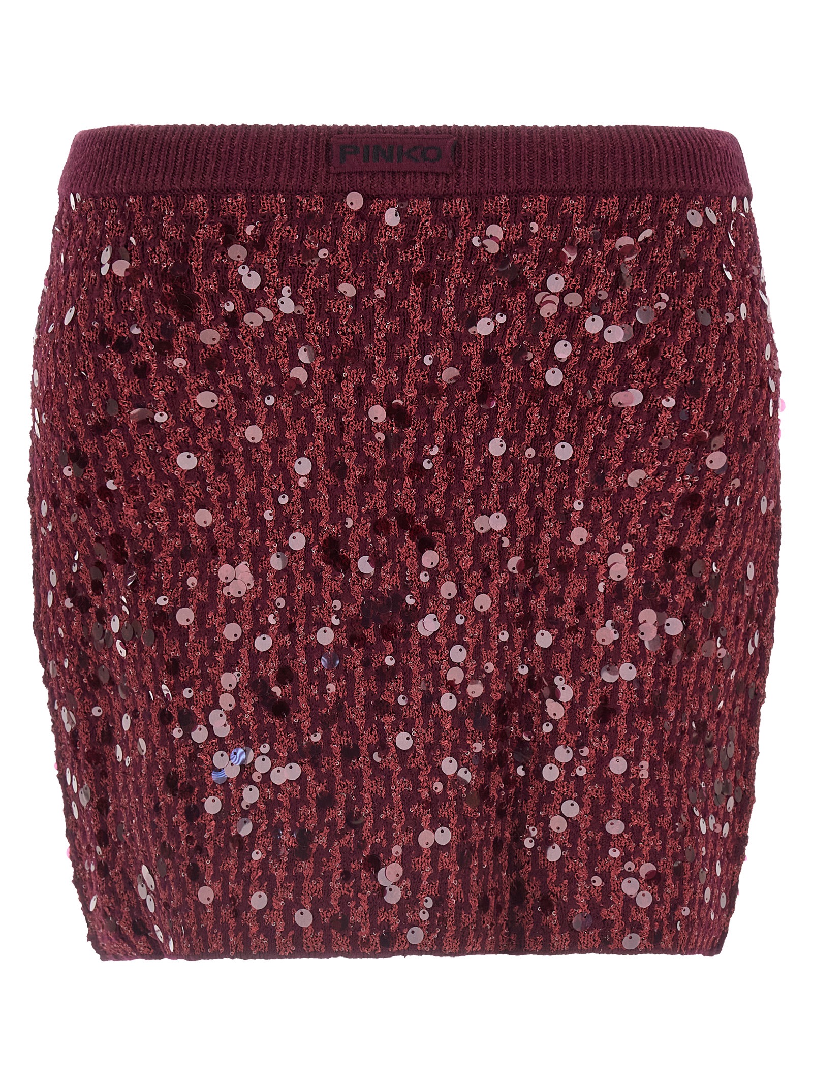 Mini ‘Gimme’ viscose flate skirt with all-over sequin appliqué, front split, elastic waistband, unlined.