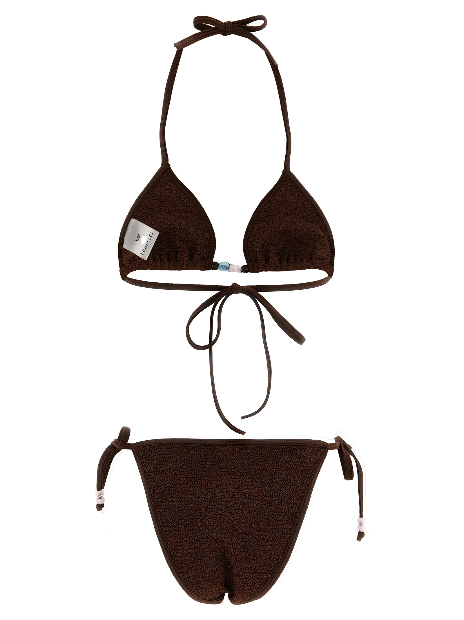 ‘Gina’ bikini in Original Crinkle™, triangle top with decorative front beads, light breast support, tie ties and briefs with classic cover, laces with decorative beads to tie.