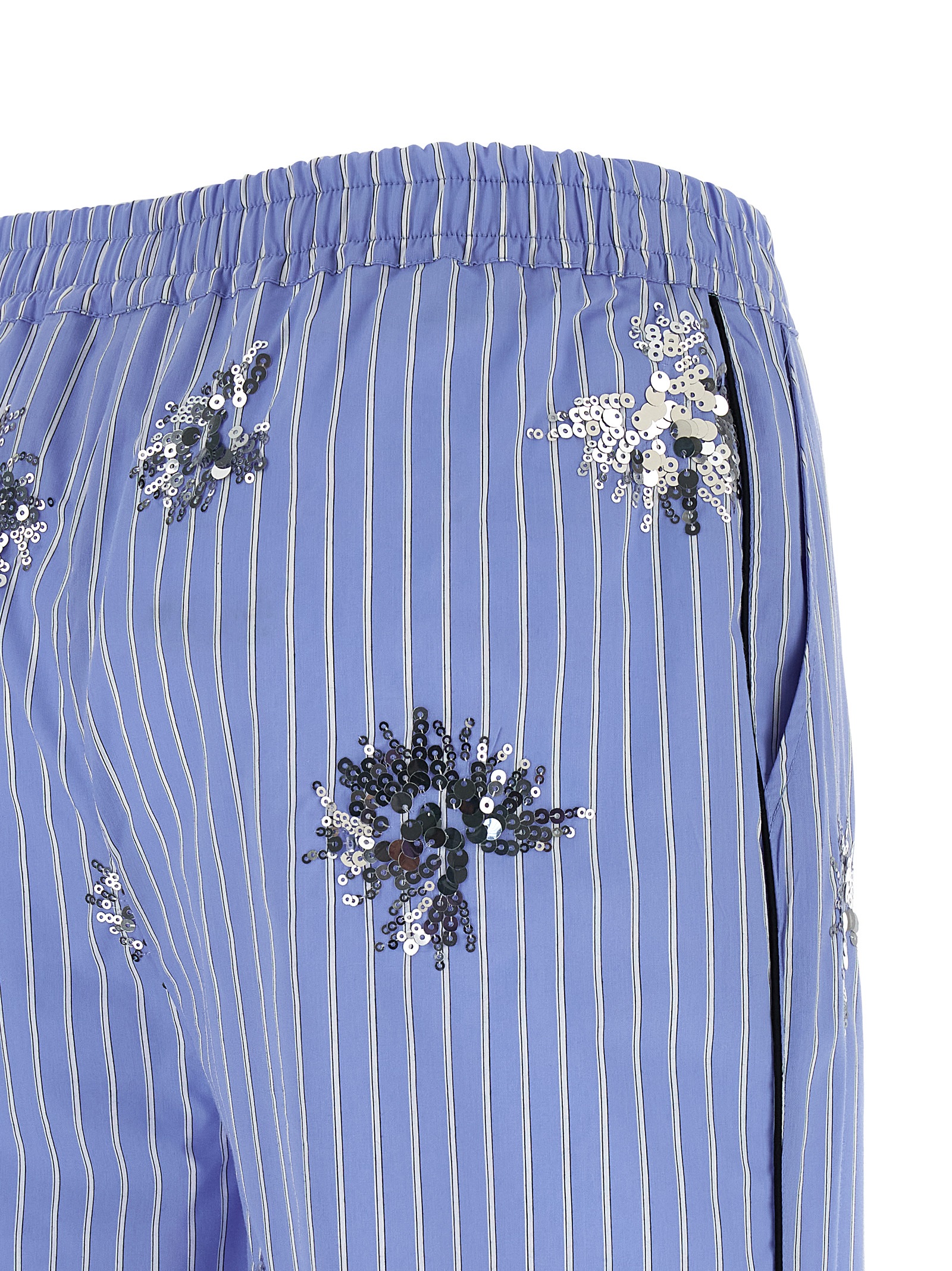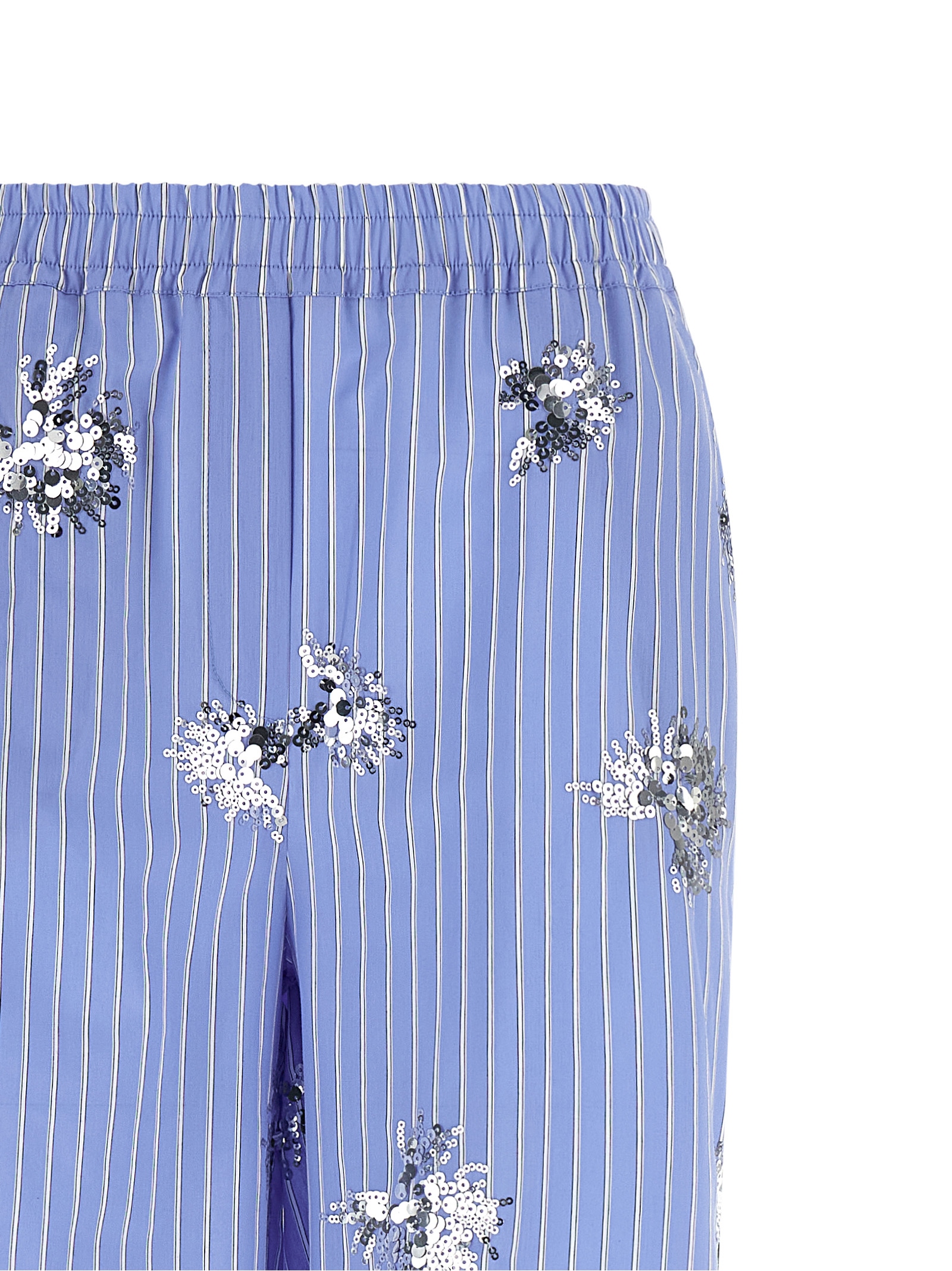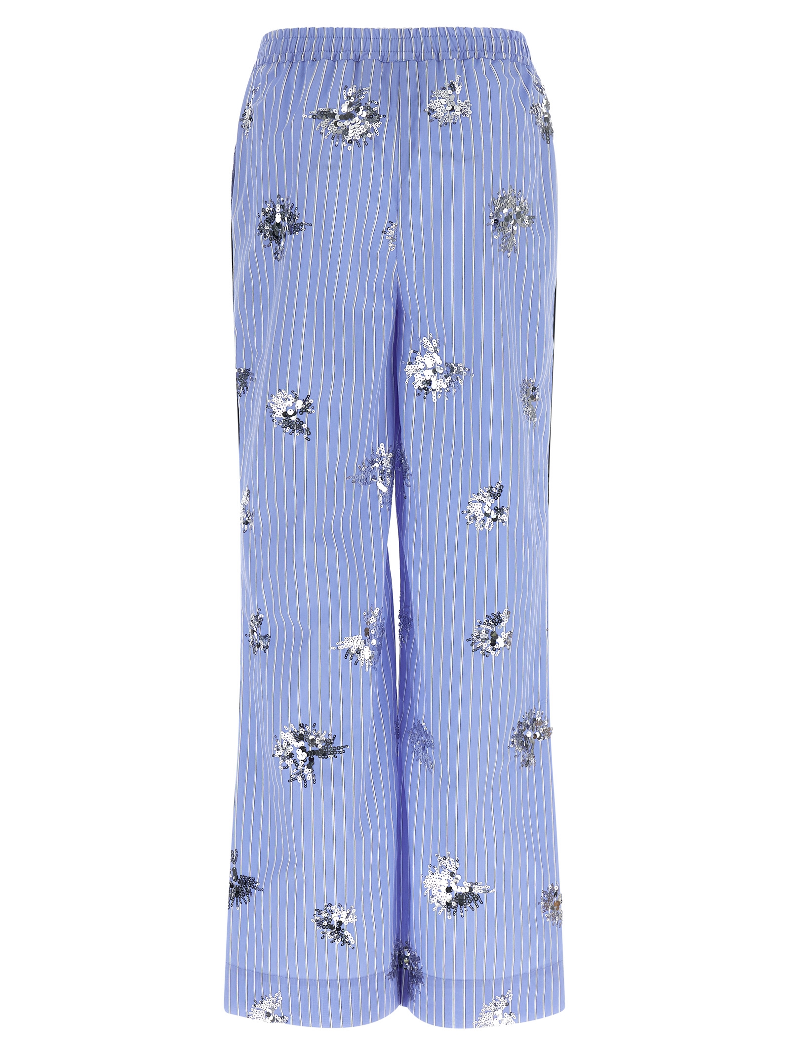 ‘Giorno’ striped cotton poplin pants with sequin embroidery, contrast satin piping, pajama style, straight leg, elastic waistband, pockets.