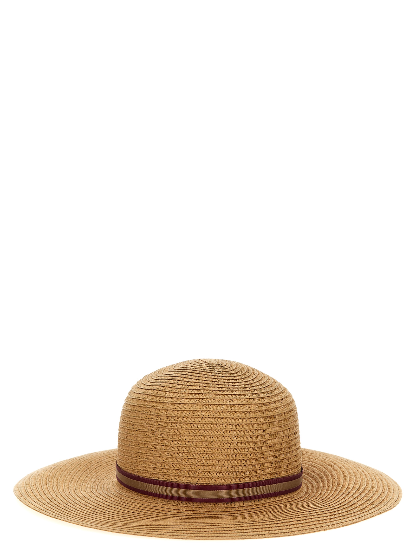 ‘Giselle’ wide-brimmed hat in paper braid with two-tone grosgrain tape detail with snap button, rollable.