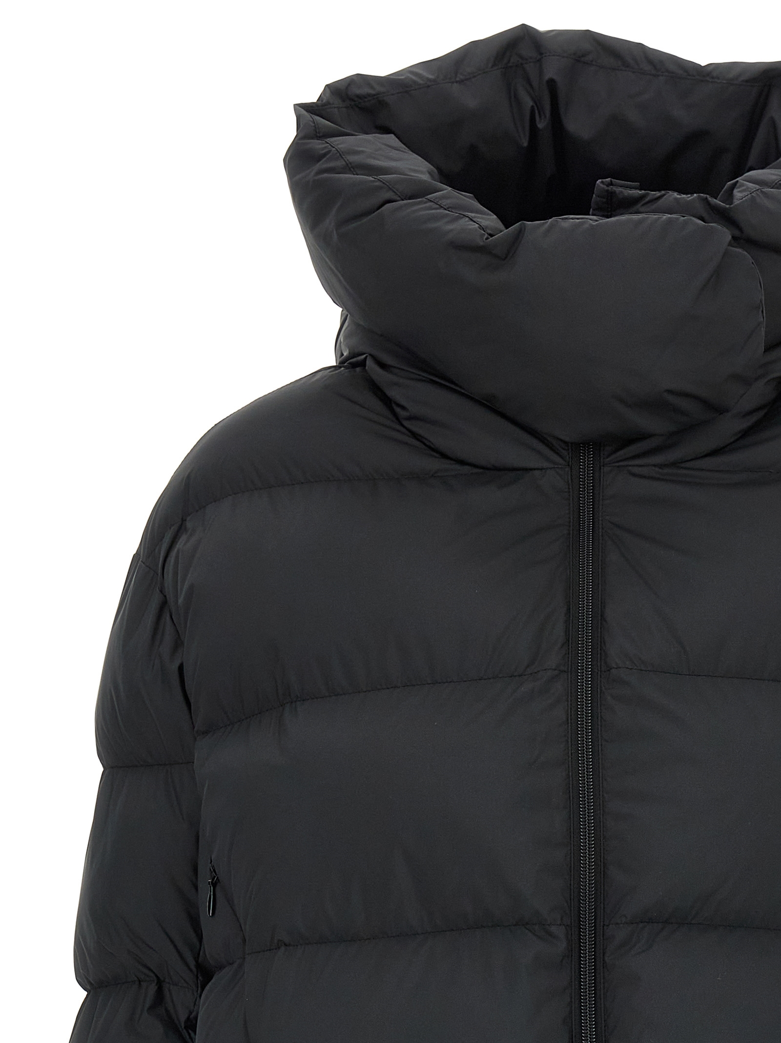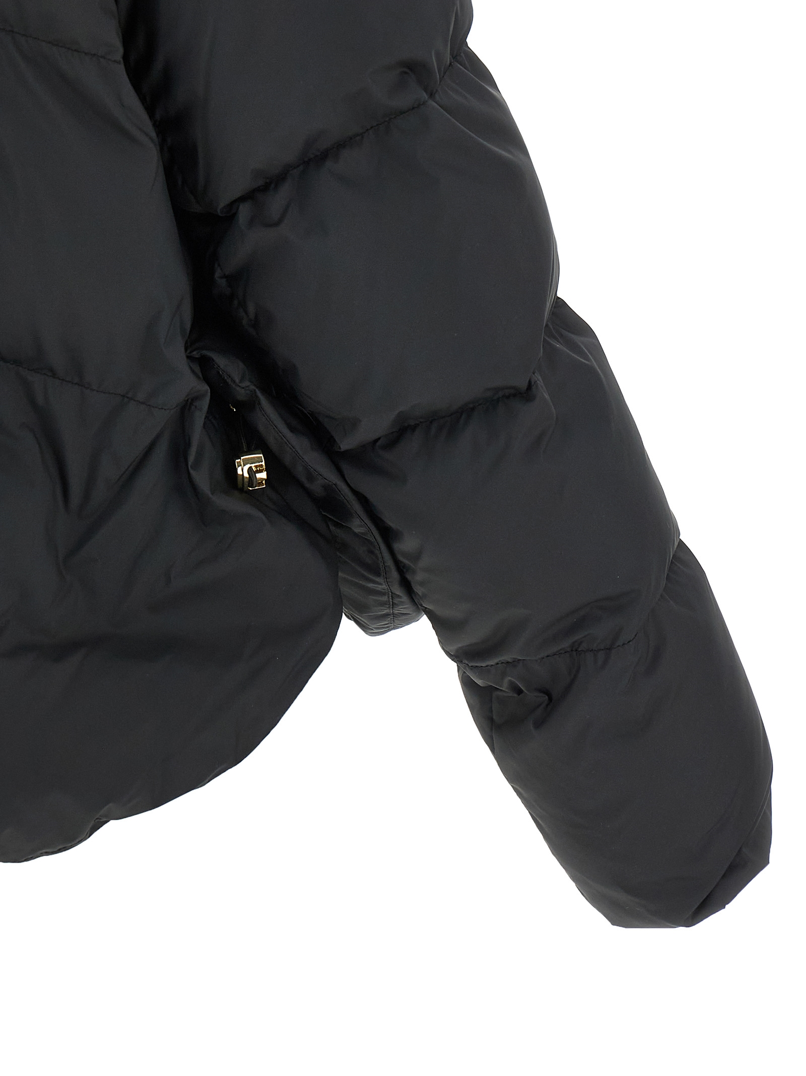 ‘Giza’ cropped quilted technical canvas down jacket, high neck with snap button closure, adjustable hood, front zip closure, pockets, long sleeves with tone-on-tone logo embroidery, drawstring on the hem, side slits.