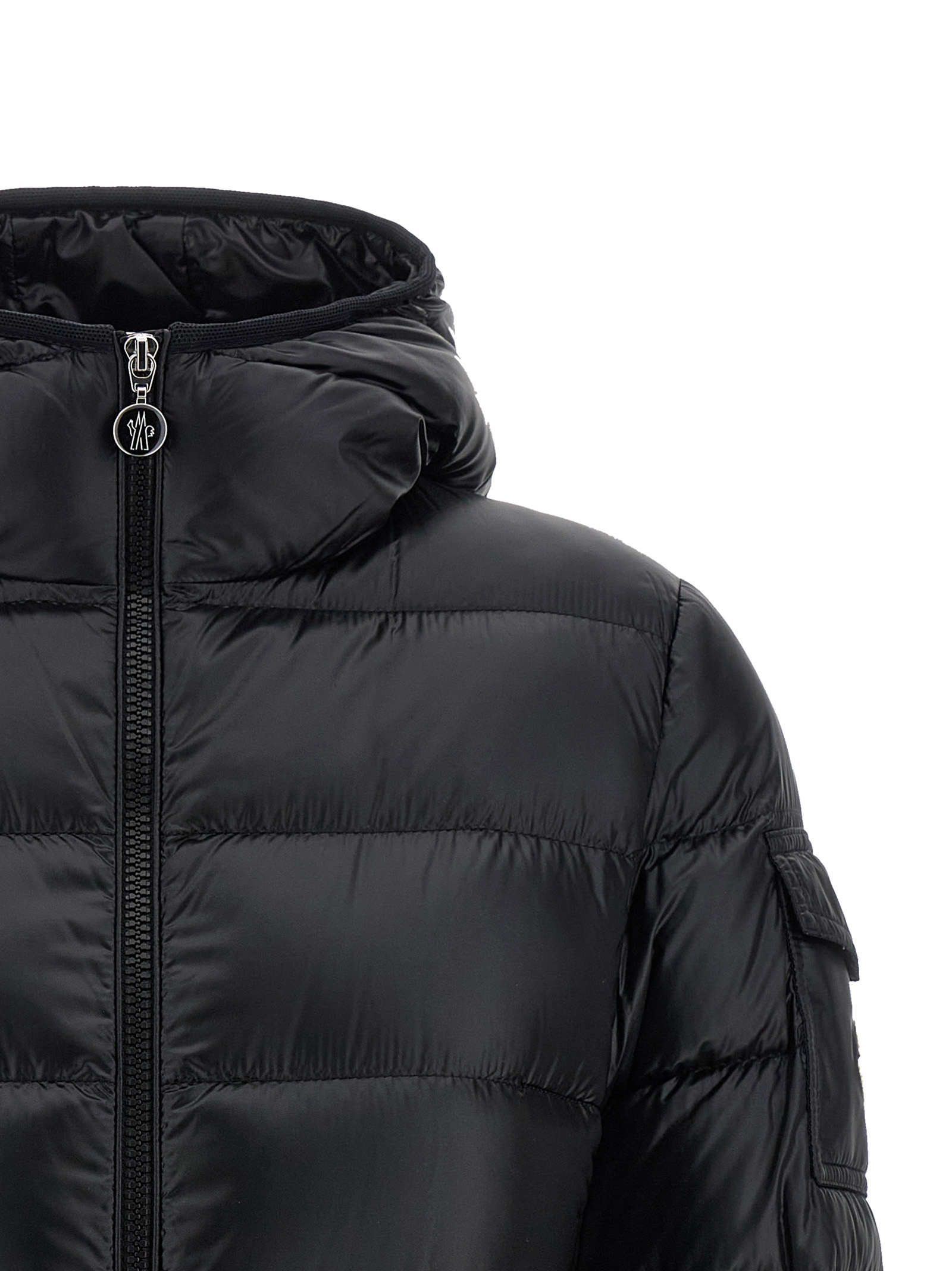 Short ‘Glesse’ quilted and goose feather padded saison longue down jacket, hourglass silhouette, hood, high neck, front zip closure, pockets, long cuffed sleeves and felt logo patch appliqué.