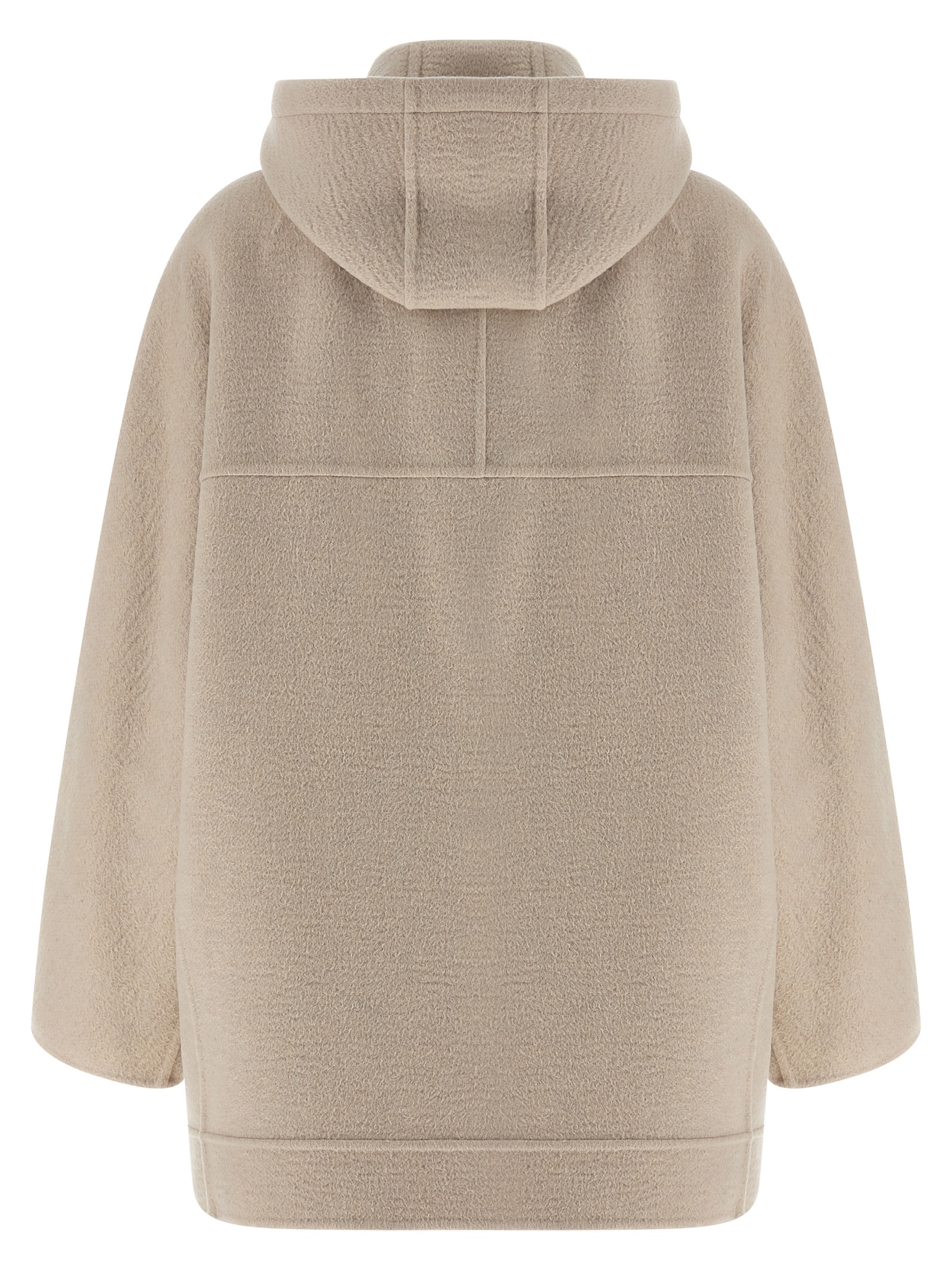 ‘Gradi’ double hand-stitched coat of pure washed cashmere, fleece style, adjustable hood with leather drawstring, front zip closure, pockets, long wide sleeves with dropped shoulder, unlined.