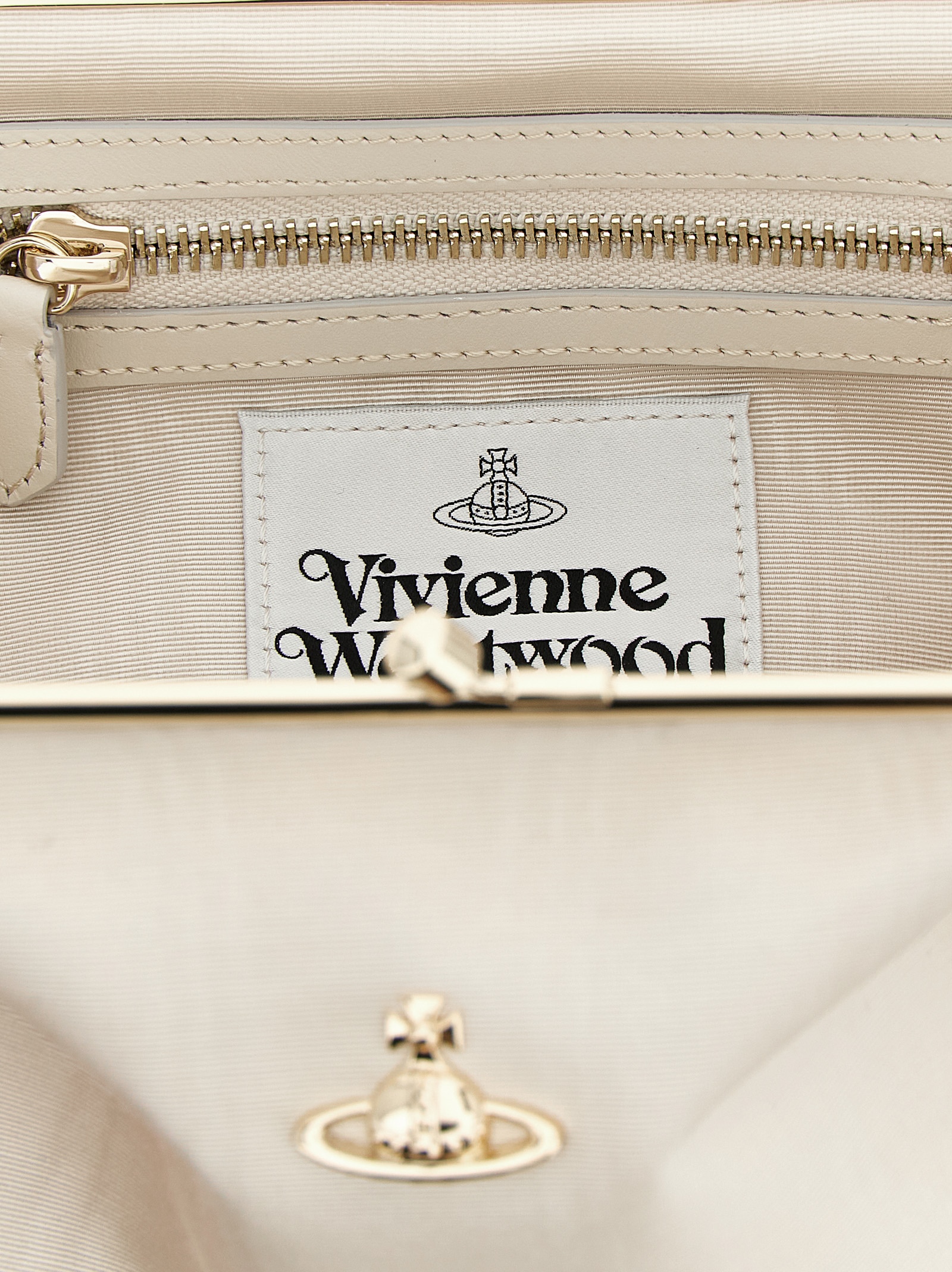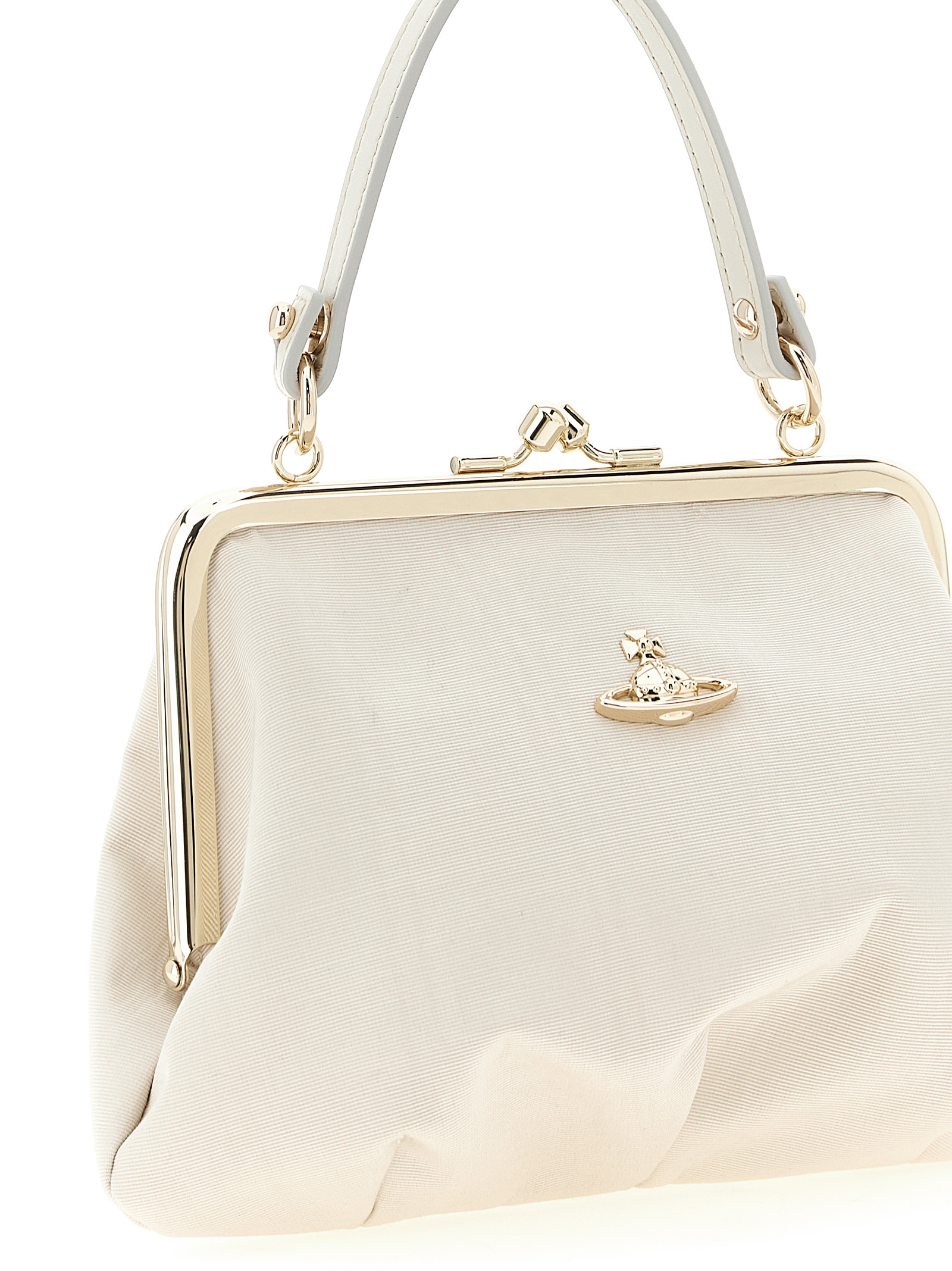 ‘Granny Frame’ handbag in Moiré fabric, front metal ‘Orb’ logo, snap closure, removable handle, removable chain shoulder strap.