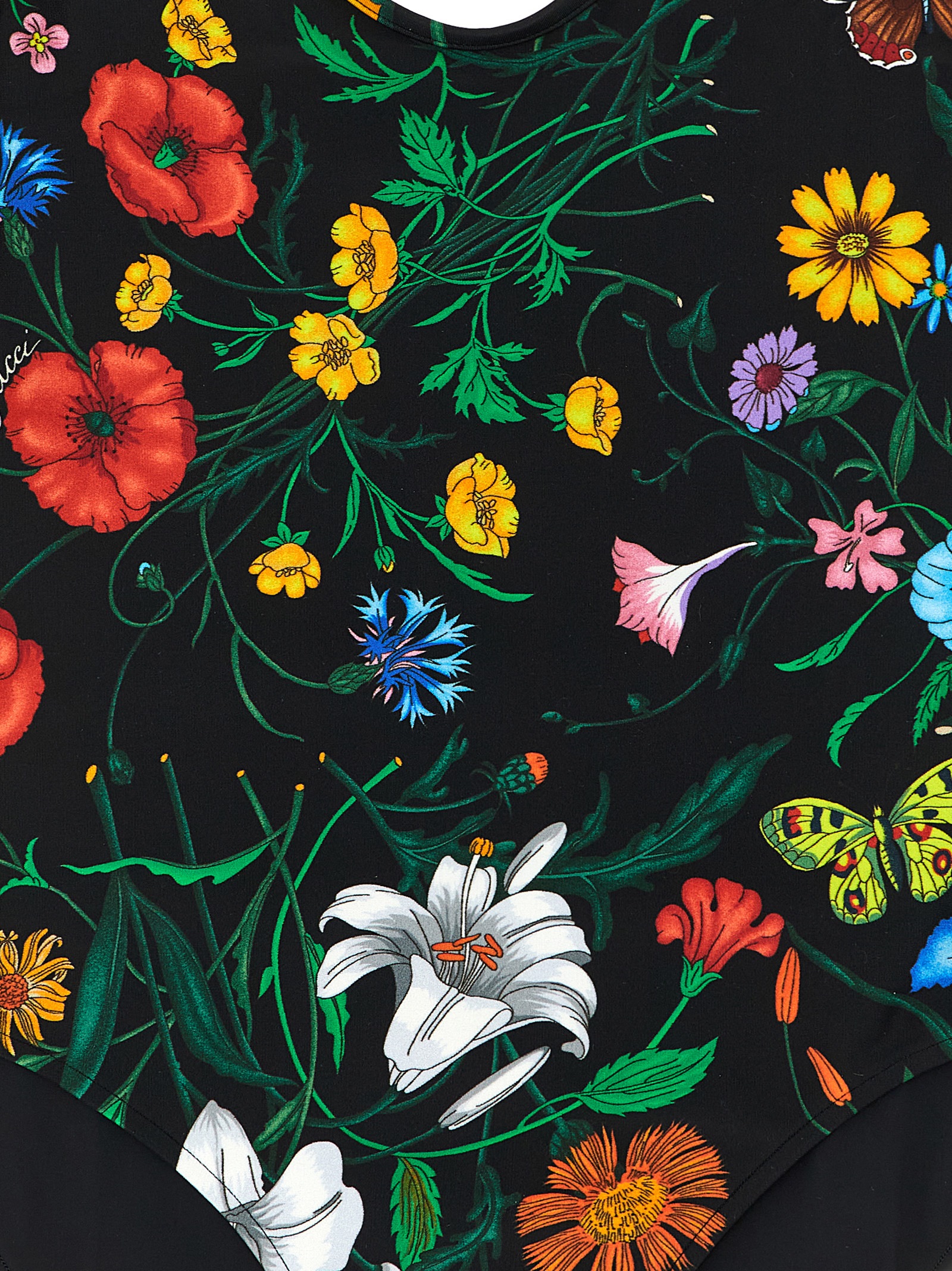 All-over sparkling jersey one-piece swimsuit with all-over ‘Gucci Flora’ print, wide round neckline at the front and back, and medium coverage.
