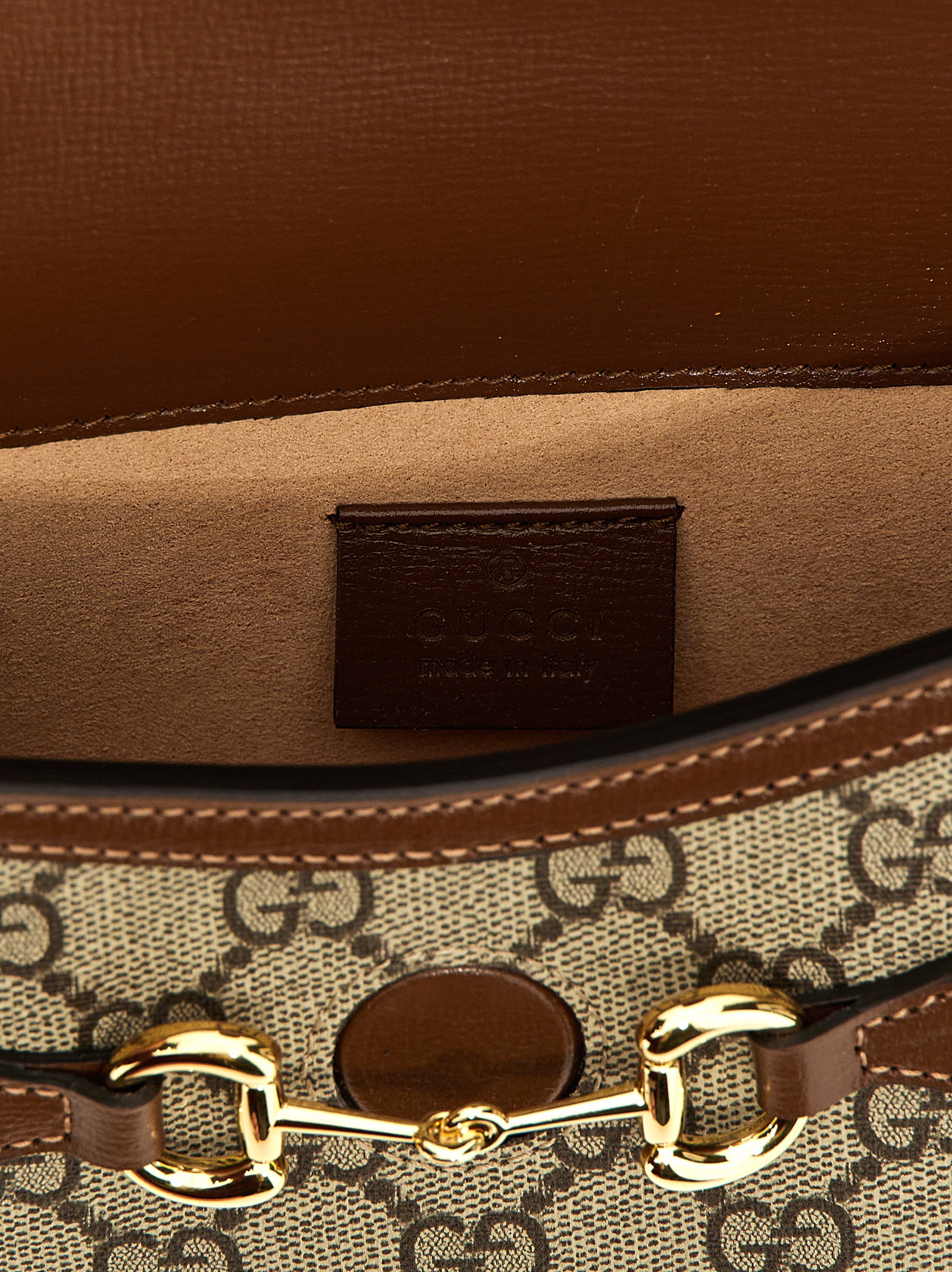 ‘Gucci Horsebit 1955’ mini crossbody bag in GG Supreme fabric and leather, front metal clamp detail, magnetic flap closure, adjustable shoulder strap.