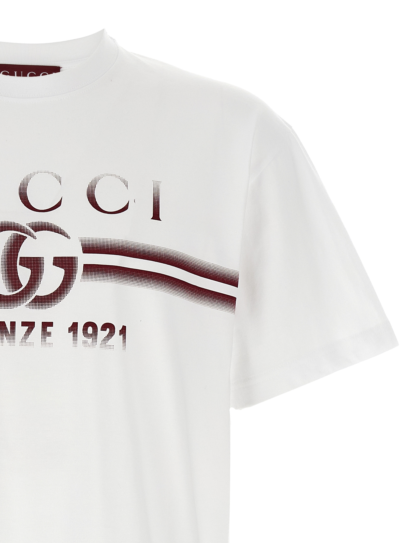 Cotton jersey T-shirt, with faded Gucci print on the front, crewneck, short sleeves with slightly dropped shoulders.