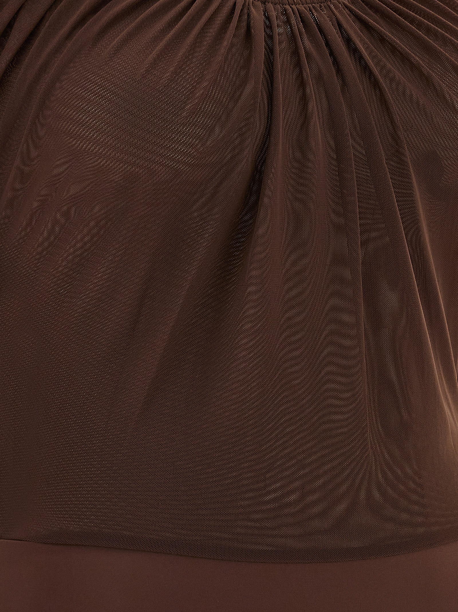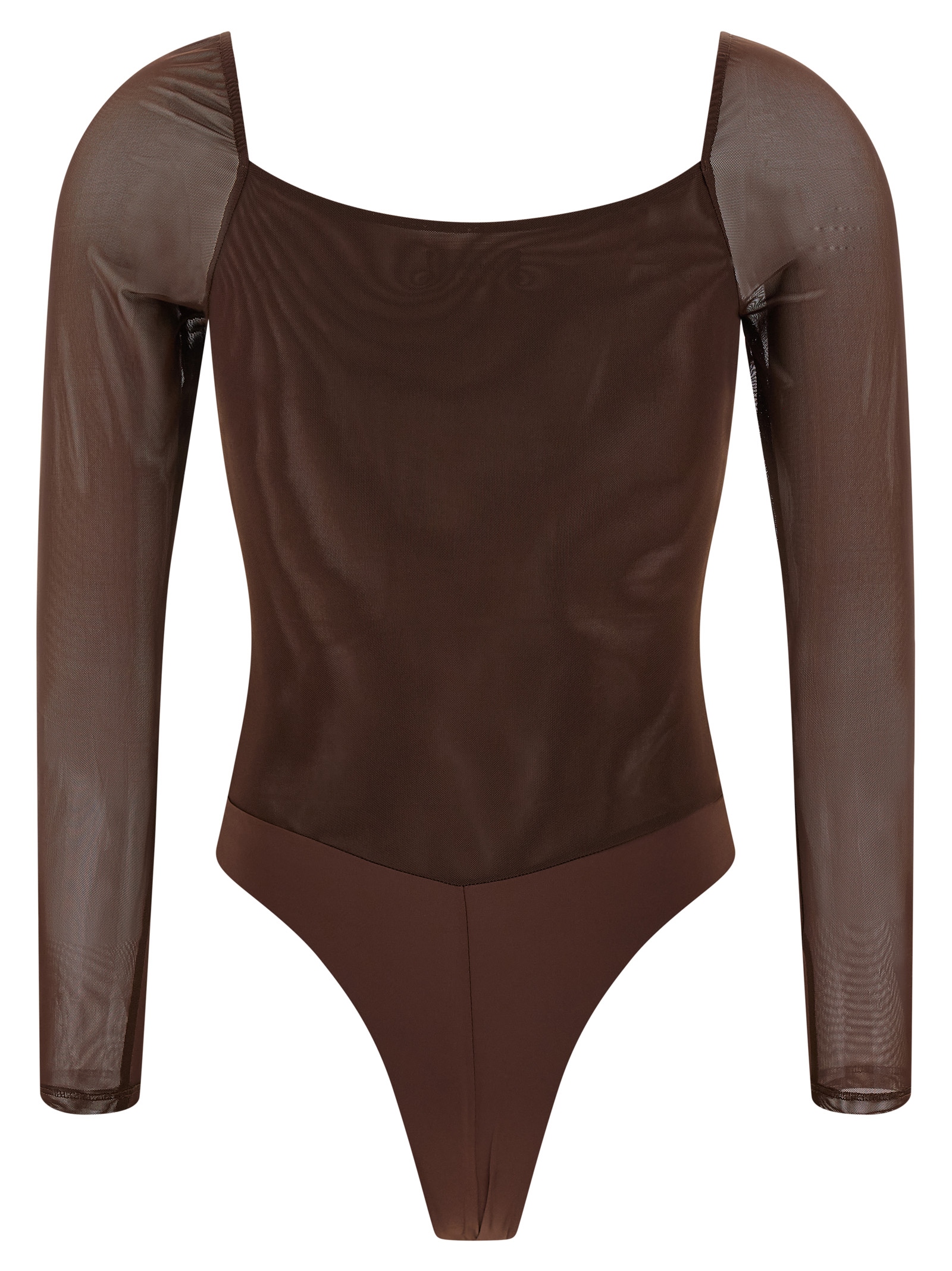 ‘Gwendolyn’ bodysuit in lightweight stretch mesh, bust lining, long semi-transparent sleeves, wide front curled round neckline, back square neckline, snap buttons on the hem.