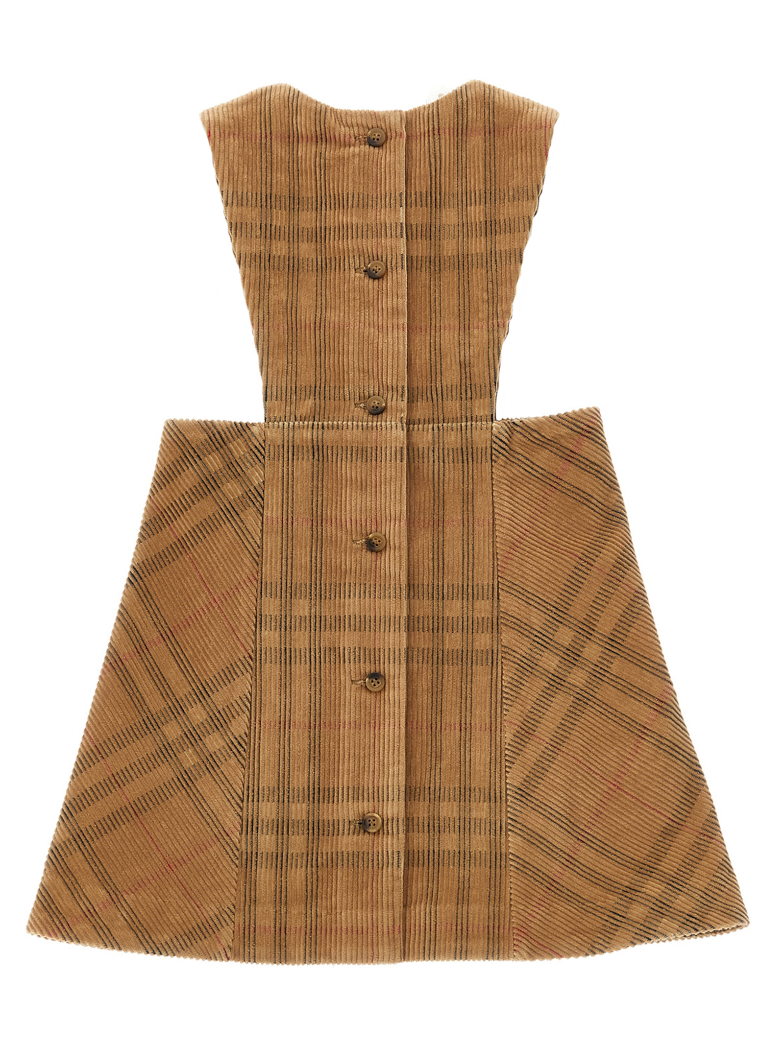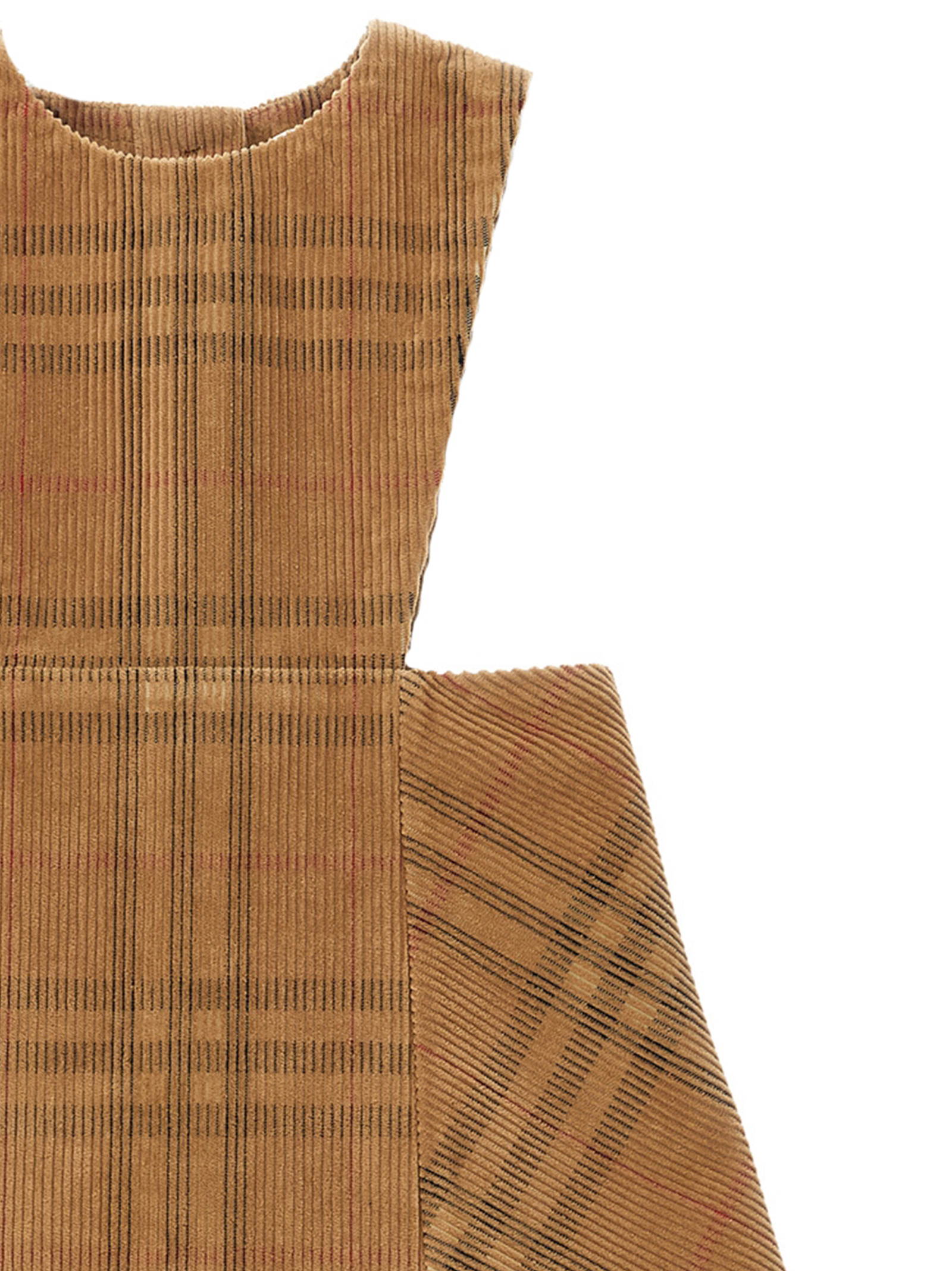 Halima’ ribbed velvet dress with woven Burberry Check, overalls style with flared silhouette, crew neck, sleeveless, back button closure.