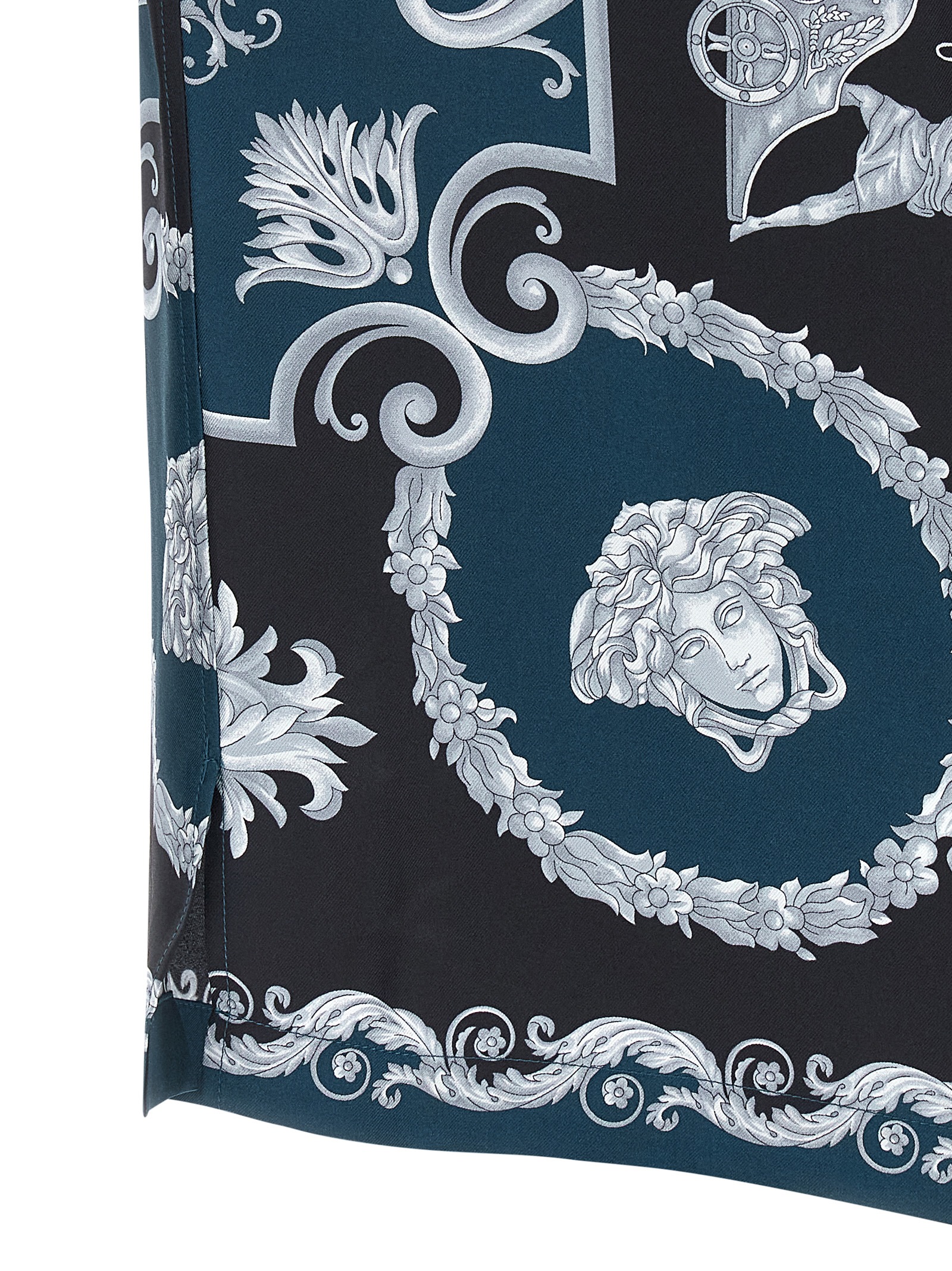 All-over ‘Hall of Heroes’ print silk twill shirt with bowling style, front button closure, short sleeves, side slits.