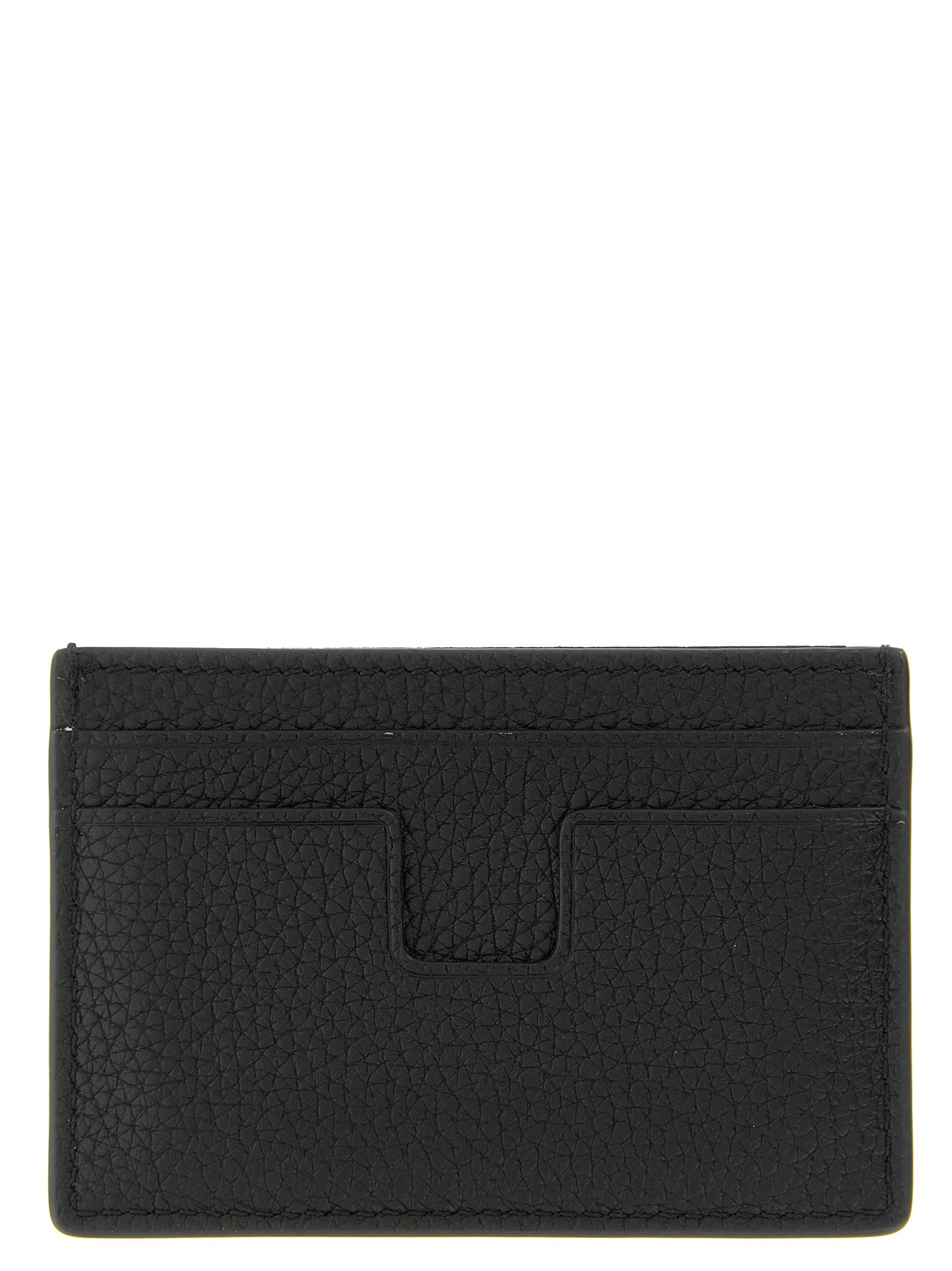 Hammered leather card holder with gold logo print.