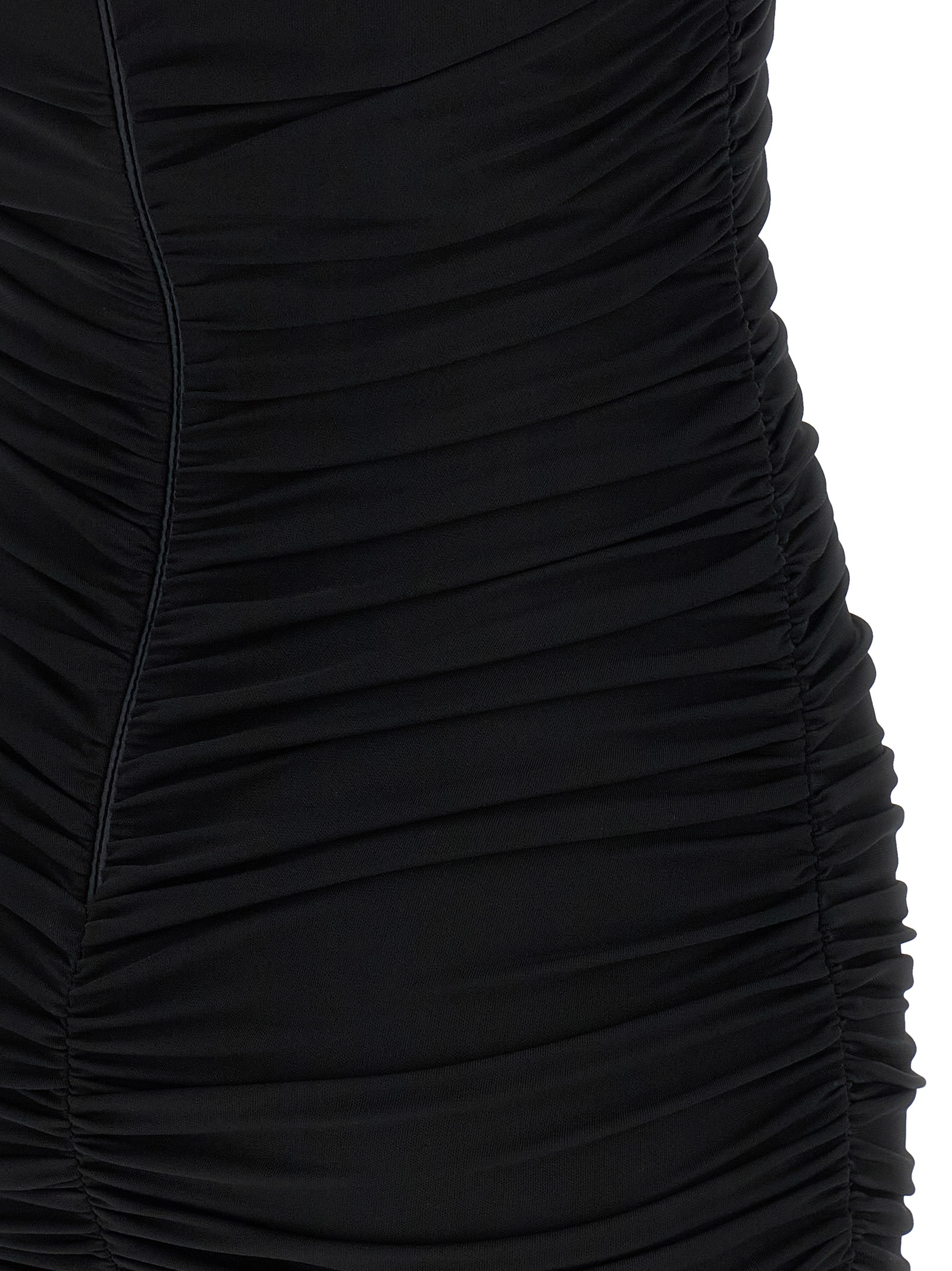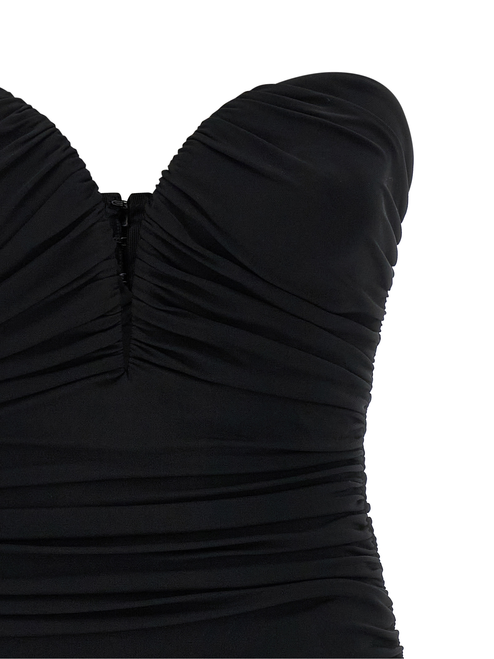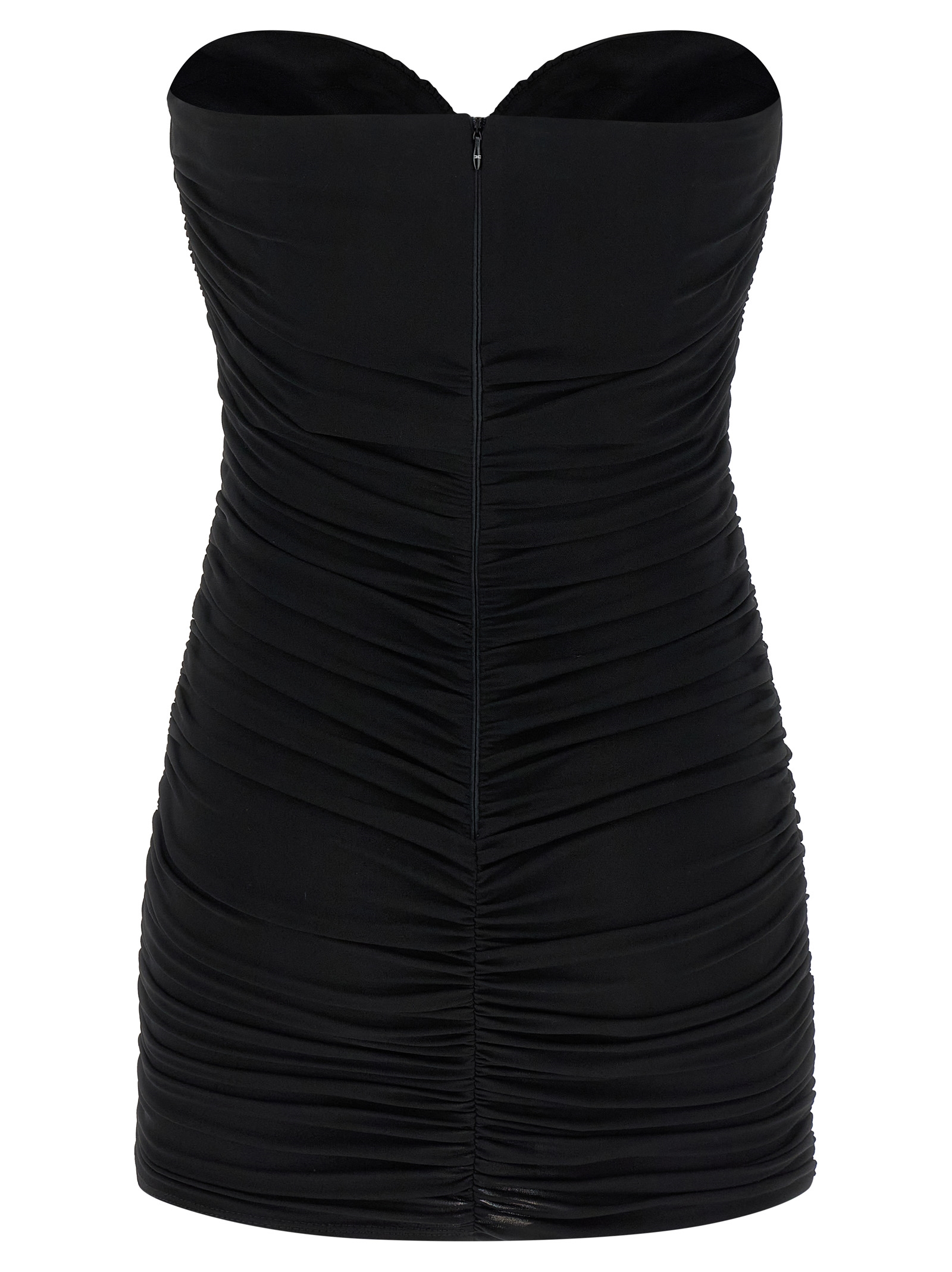 Sleeveless mini dress in crêpe jersey with draping on the front and back, off-the-shoulder style with sweetheart neckline, inner corset with preformed cups, side splints and back zip closure, metal logo with crystals on the front, back zip closure.