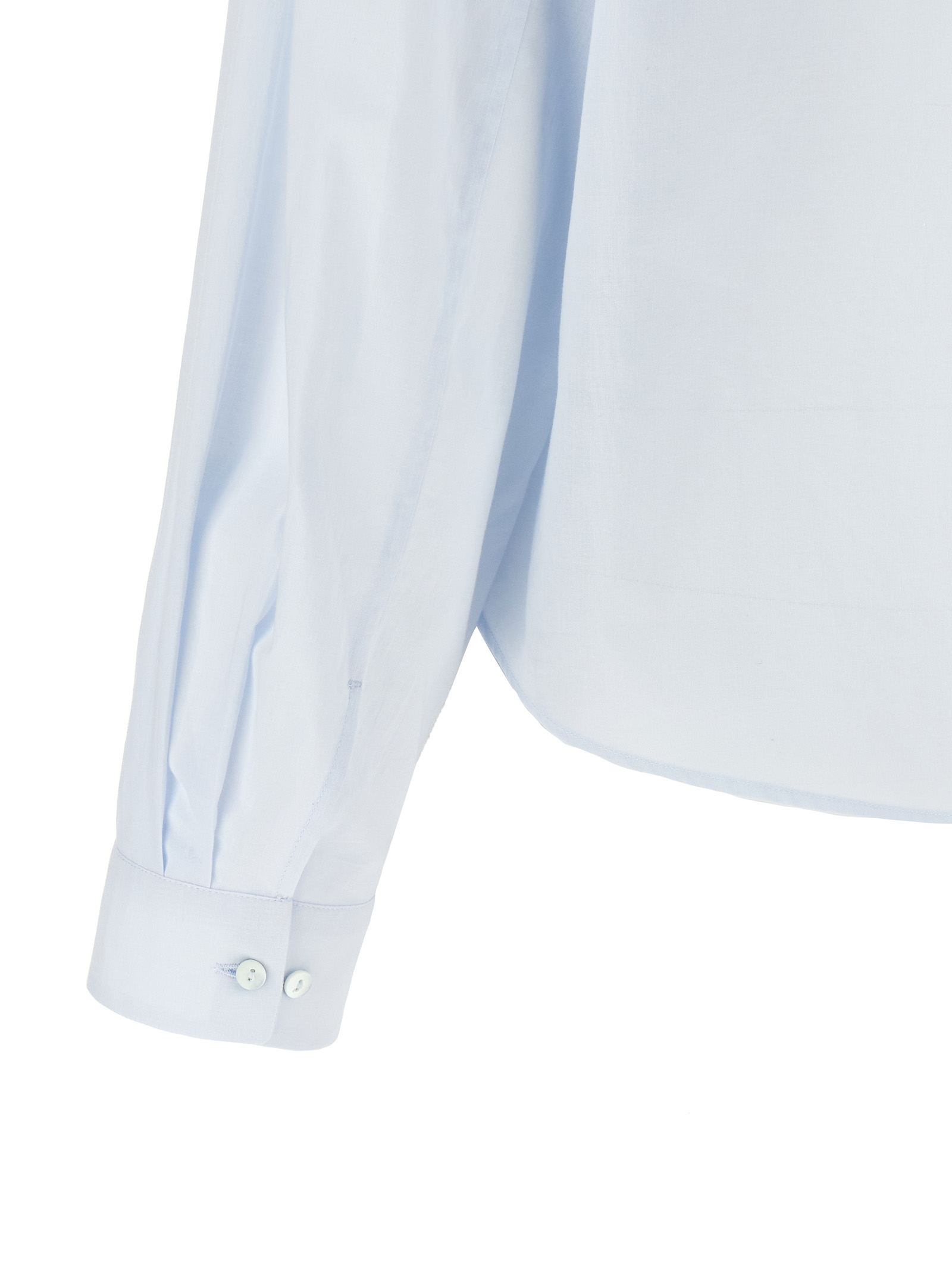 ‘Heather’ crop shirt in cotton poplin with pointed collar, front mother-of-pearl button closure, long sleeves with cuffs and dropped shoulders, rounded hem.