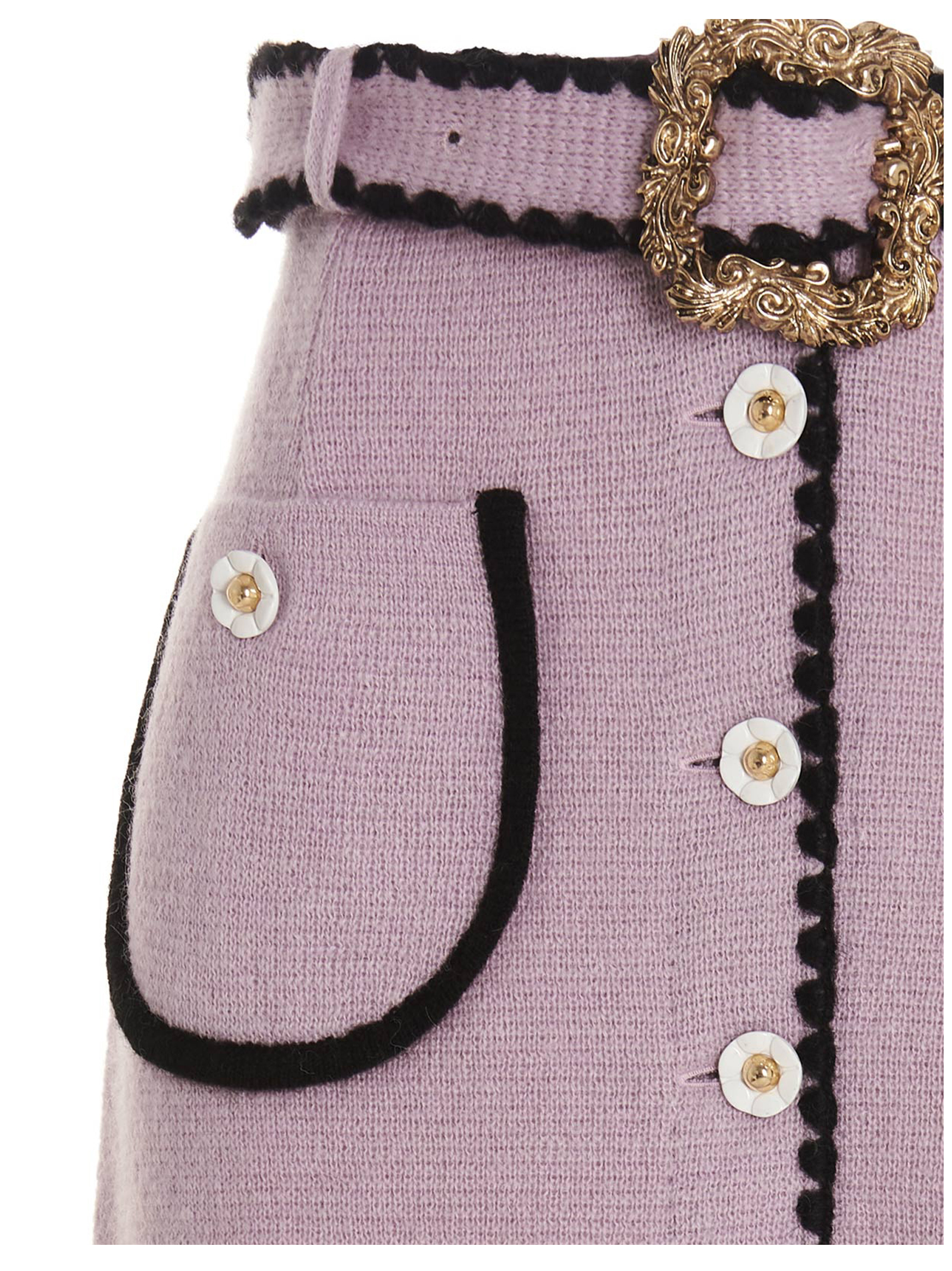 ‘Helga’ wool blend skirt with high waist, belt at the waist with gold buckle and jewel flower-shaped buttons.