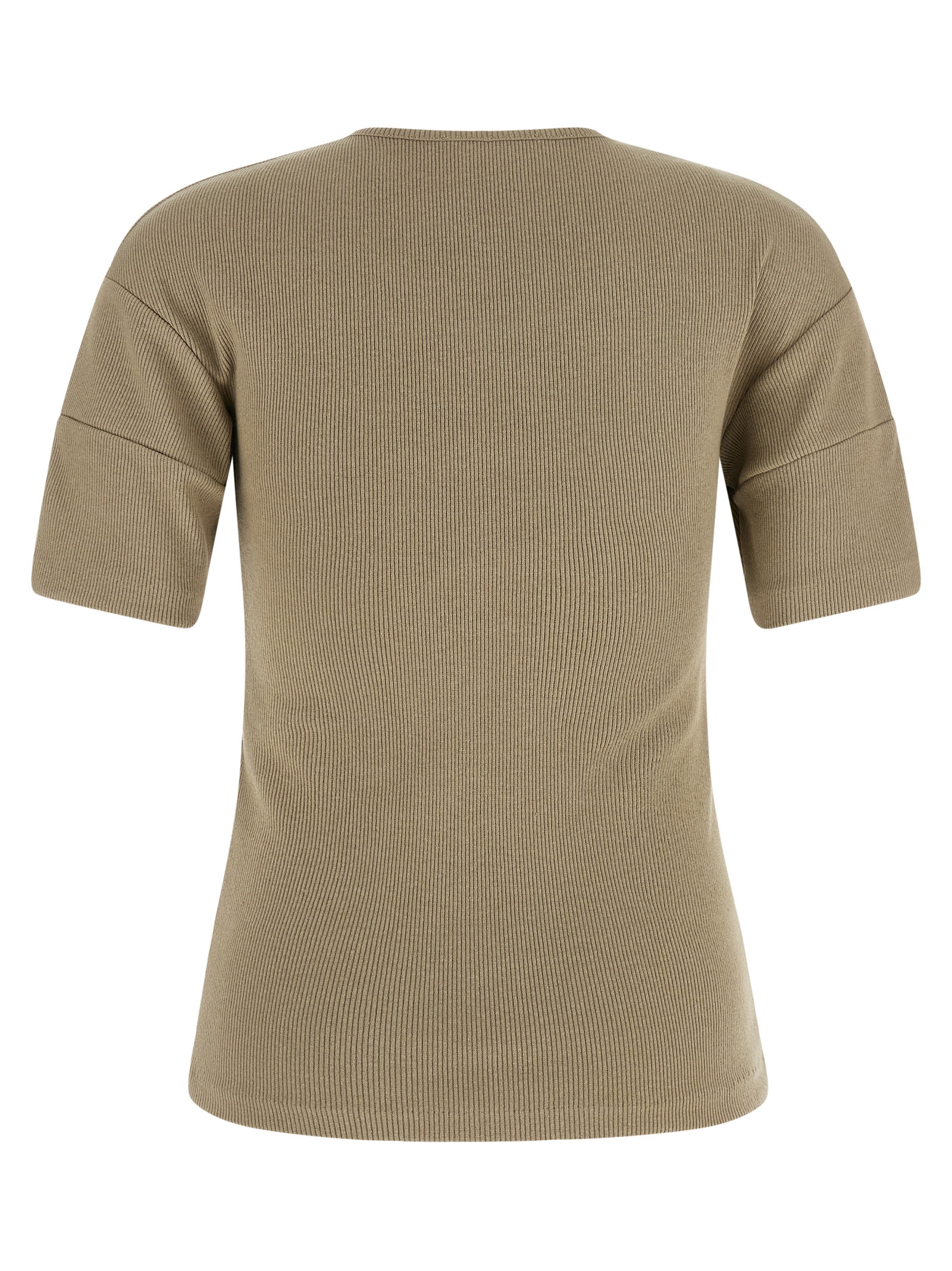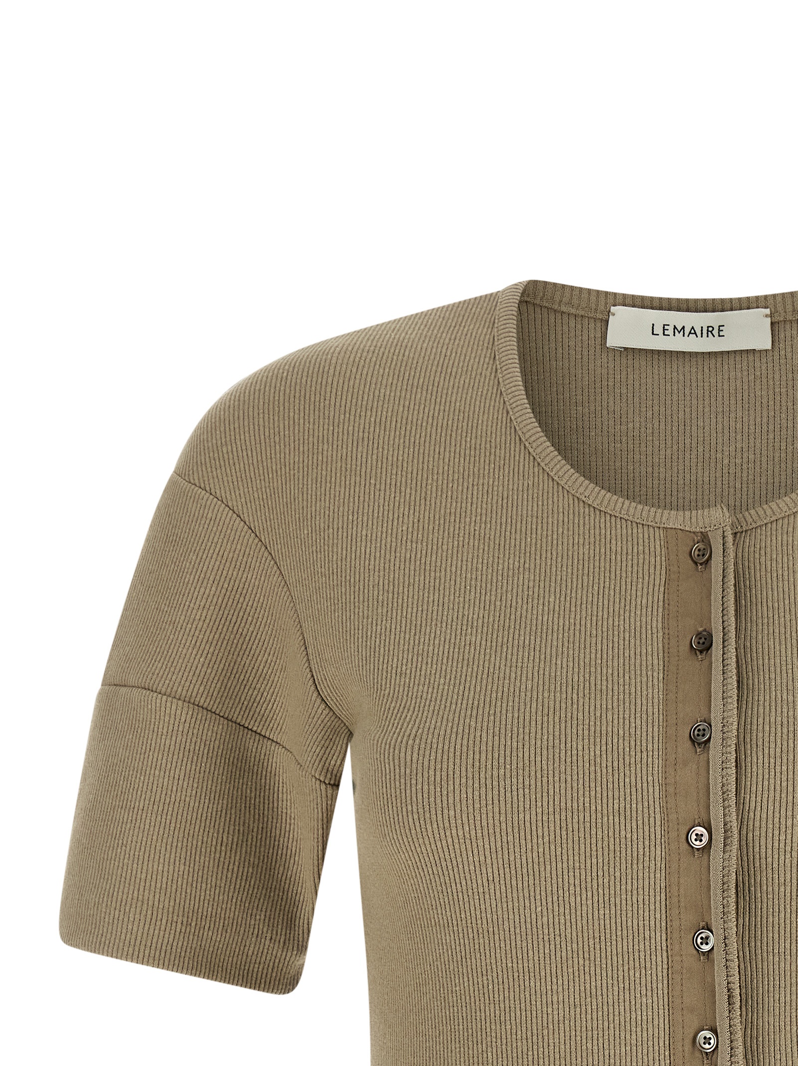 ‘Henley’ ribbed cotton and linen jersey sweater, round neckline with mother-of-pearl button closure and contrast fabric on the front buttoning, short sleeves with 3D effect pleats.