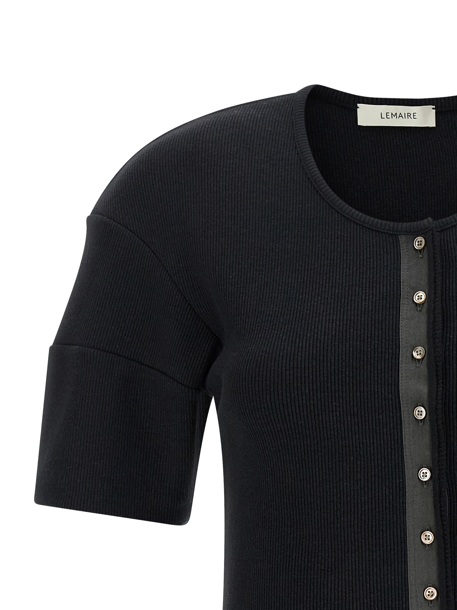 ‘Henley’ ribbed cotton and linen jersey sweater, round neckline with mother-of-pearl button closure and contrast fabric on the front buttoning, short sleeves with 3D effect pleats.