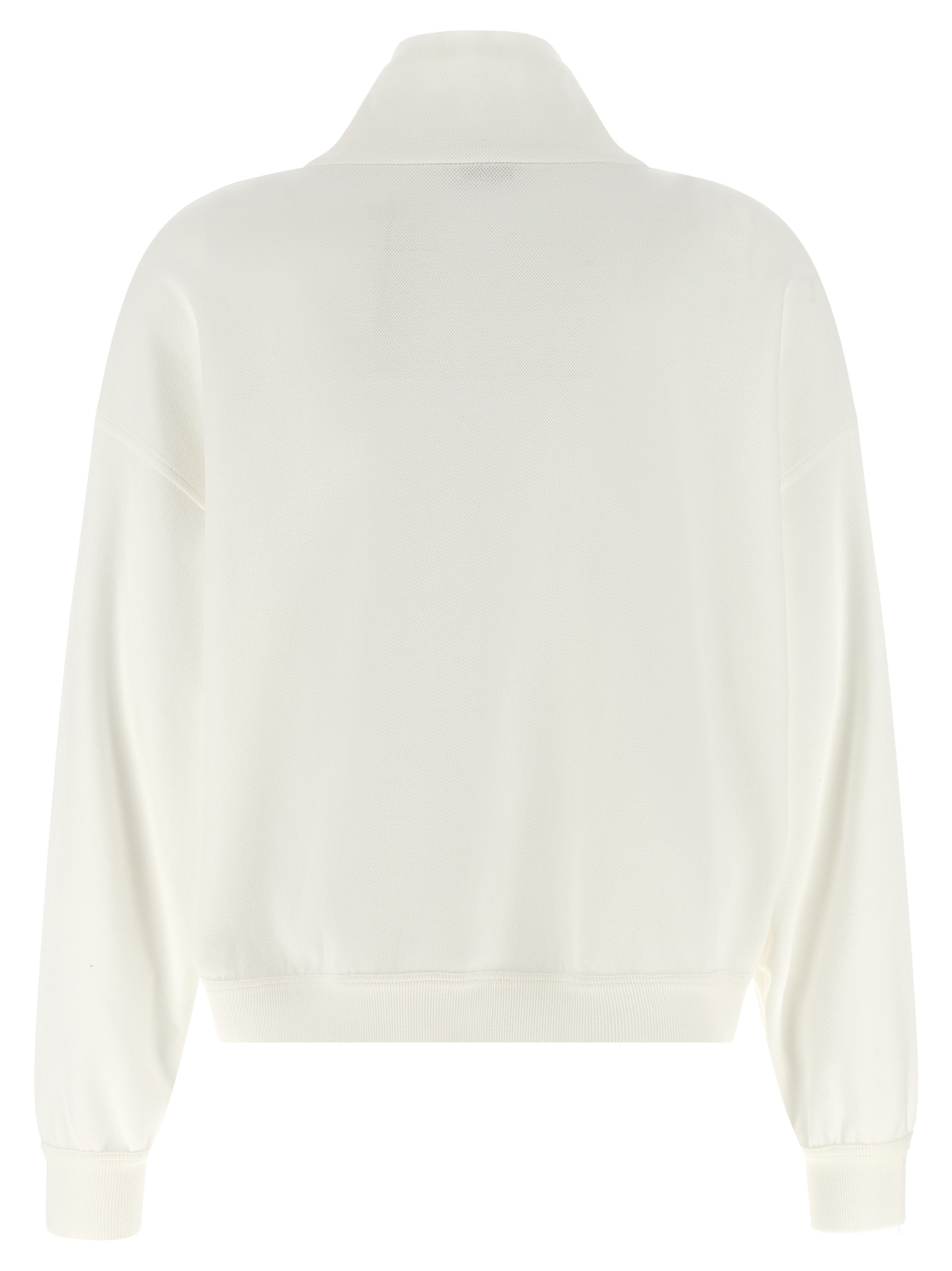 Piqué cotton sweatshirt with ribbed stretch cotton details, front Solomeo heraldic coat of arms patch, crater collar, half zip, long sleeves with cuffs and dropped shoulders, band on the hem.
