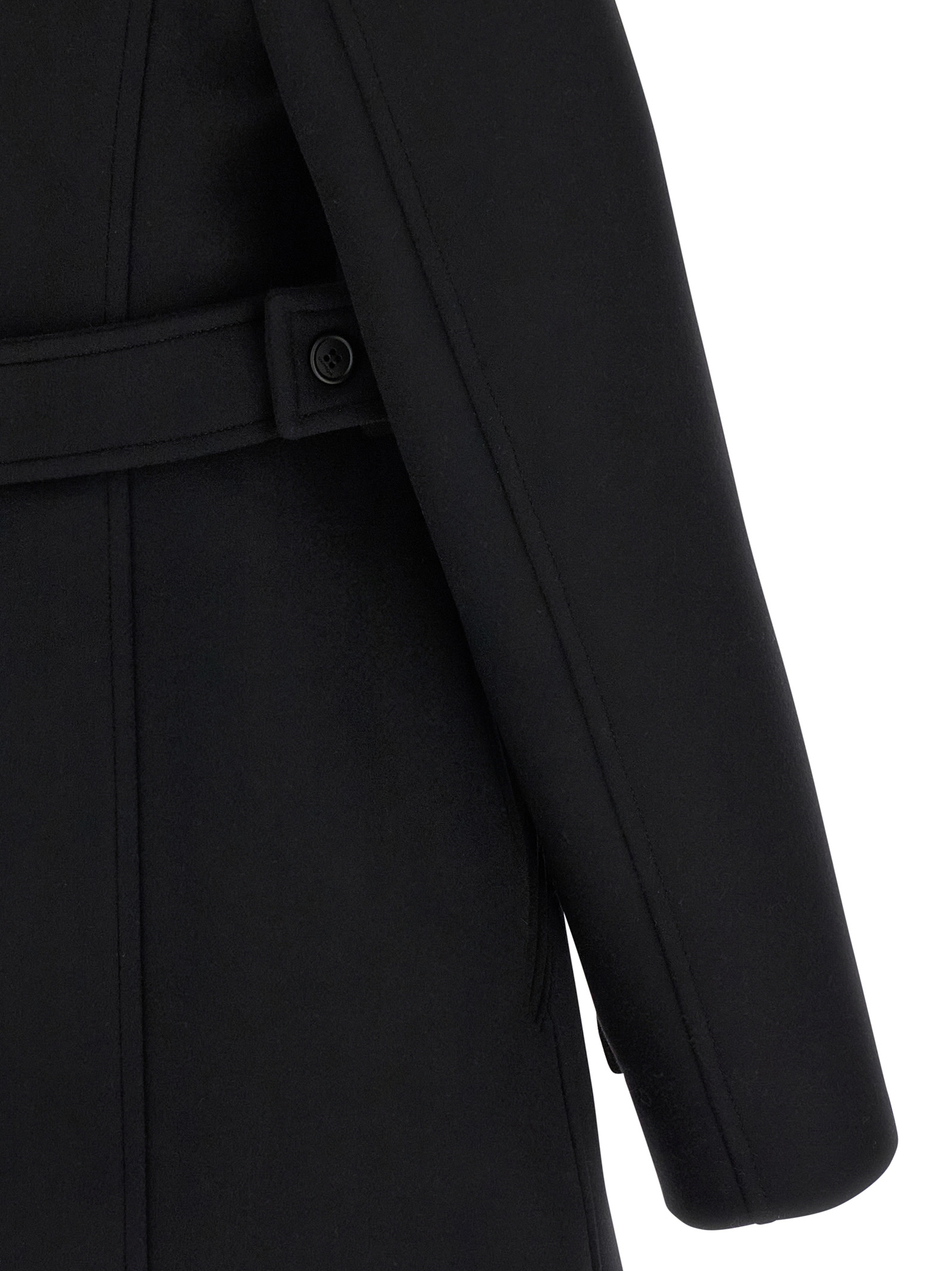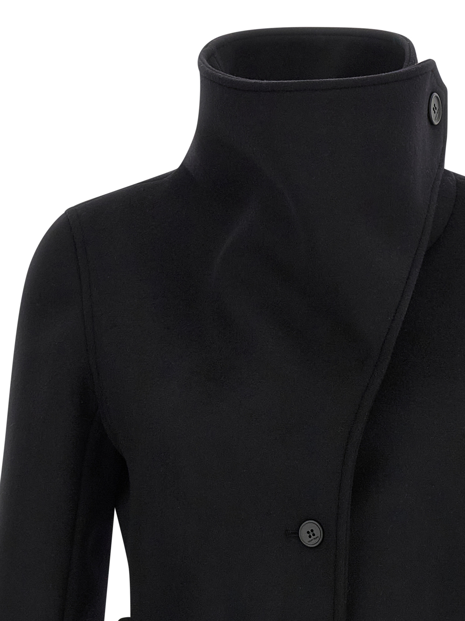 Heritage’ wool and silk coat, high neck with side button closure, front button closure, pockets, long sleeves with zip on the cuffs, adjustable and removable back belt, lining.