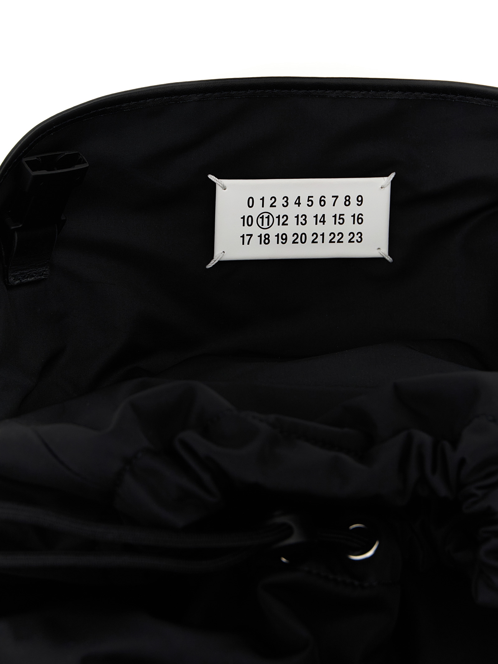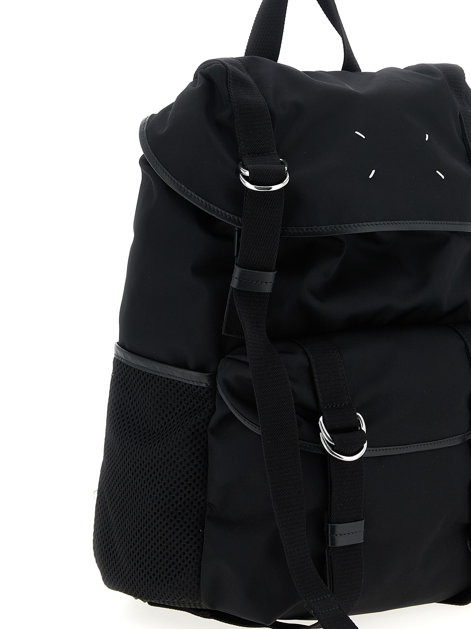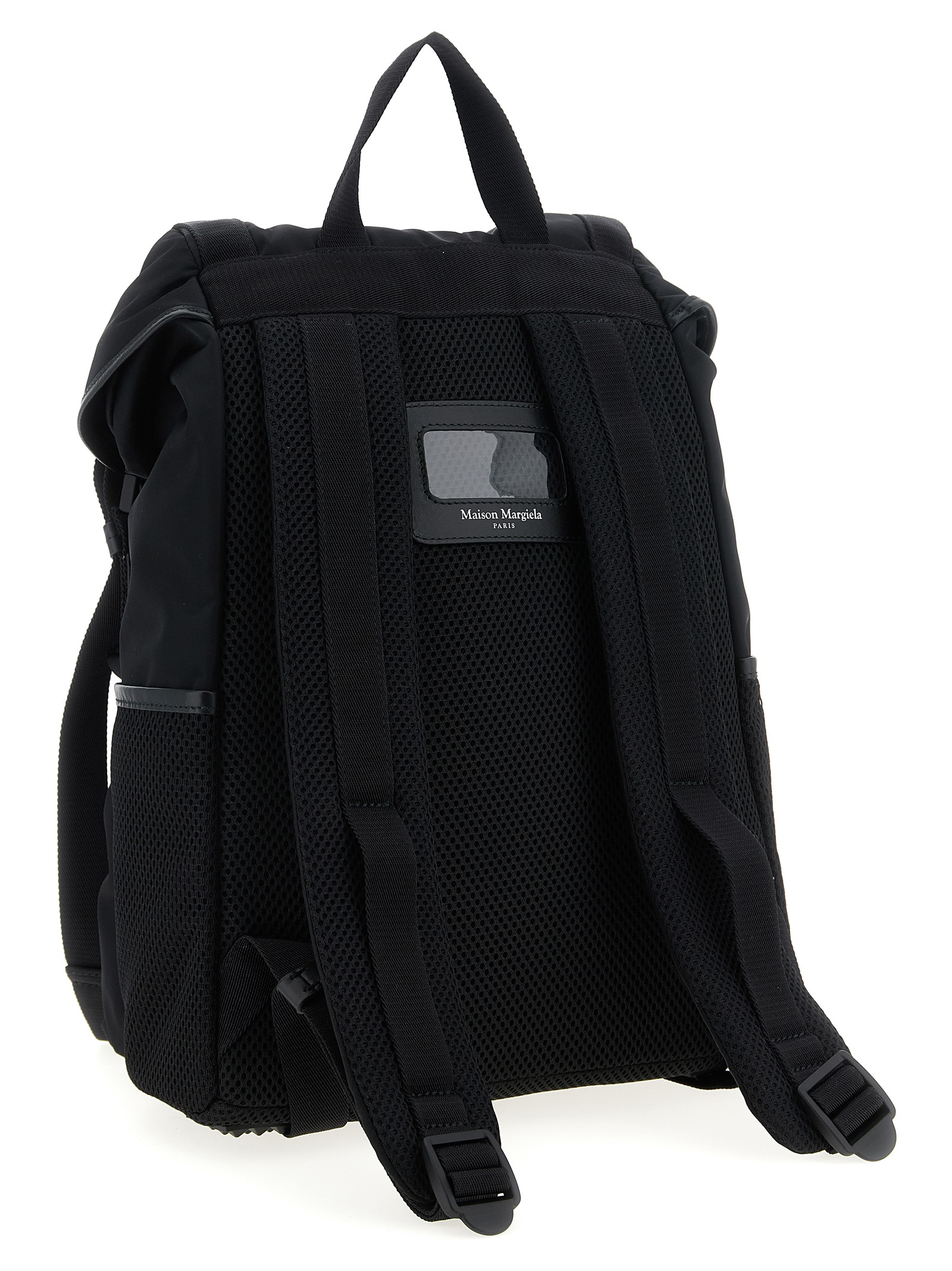 ‘High Tech Medium’ backpack in structured fabric with mesh inserts, metal details, top flap with tuc closure, inner and ‘Four stitches’ drawstring, fixed handle, pockets, adjustable shoulder straps, reinforced backrest.