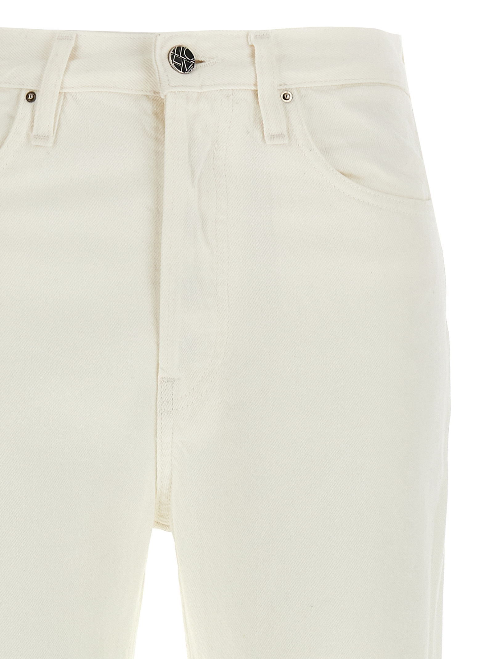 High-waisted cotton denim jeans with straight leg, five pockets, button closure, raw cut leg bottoms, and leather logo label on the back.