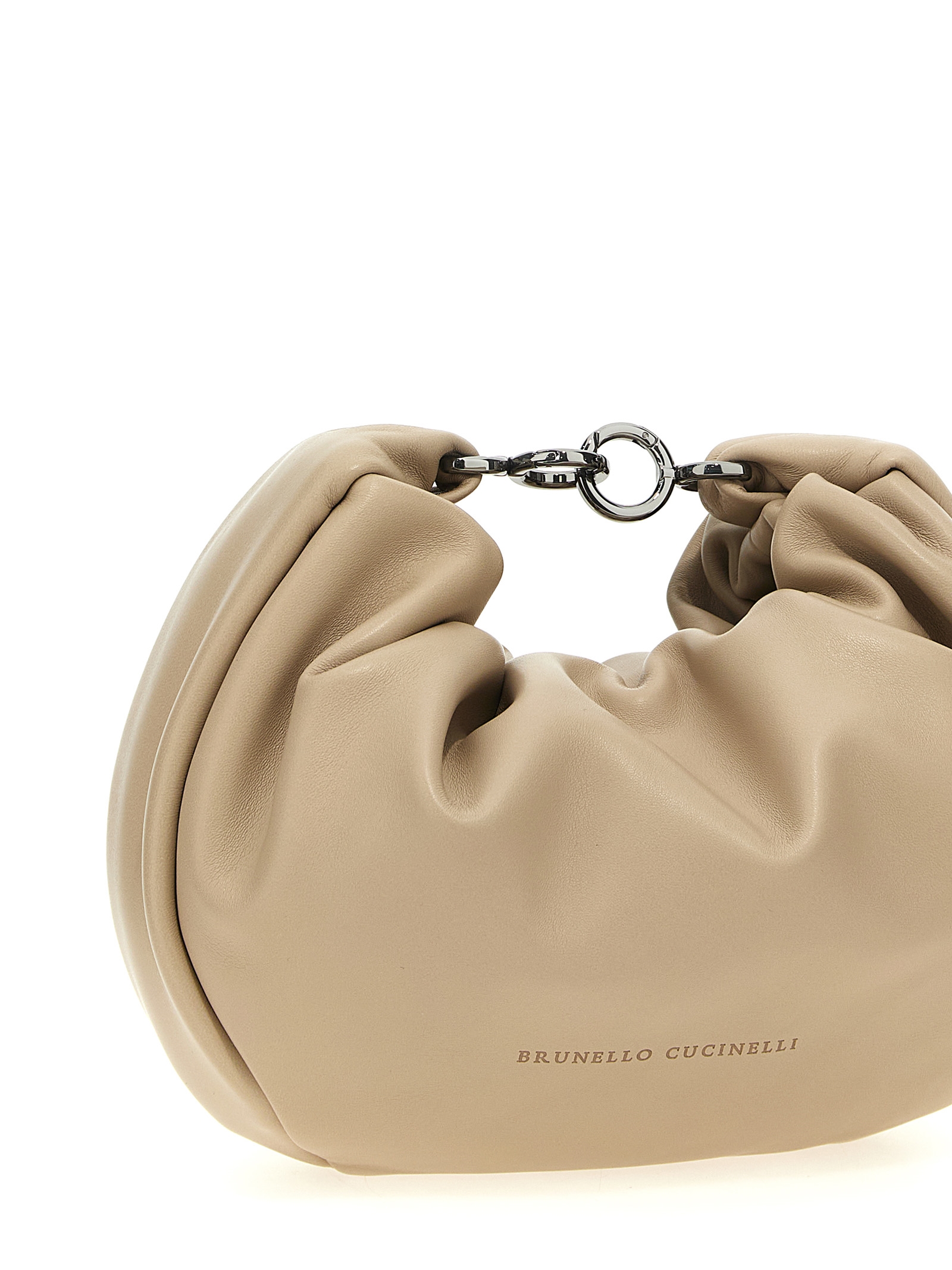‘Hobo Brioche’ nappa crossbody bag, front embossed logo, zip closure, removable Monile shoulder strap. If hooked, the two carabiners allow you to carry the bag by hand.