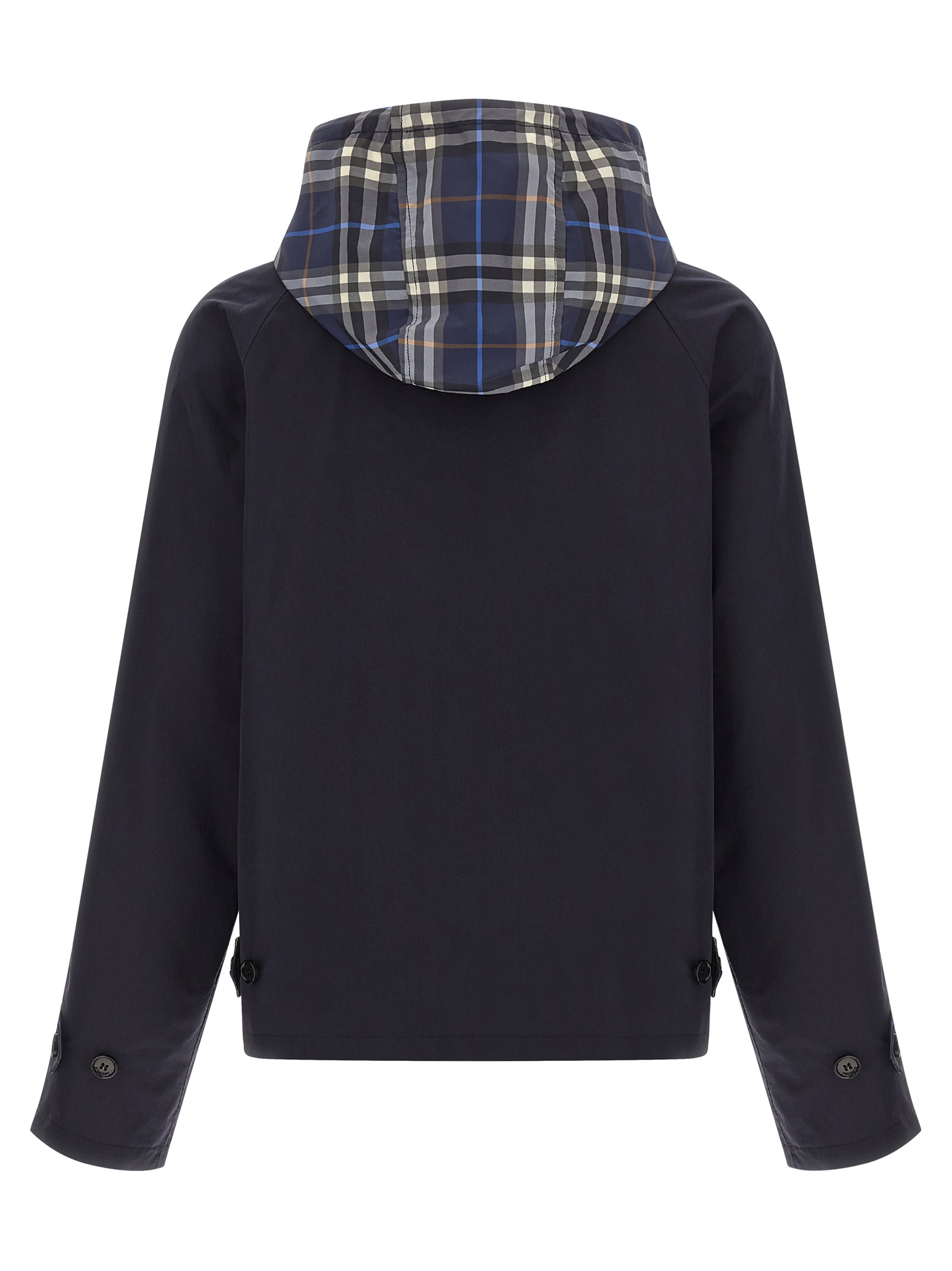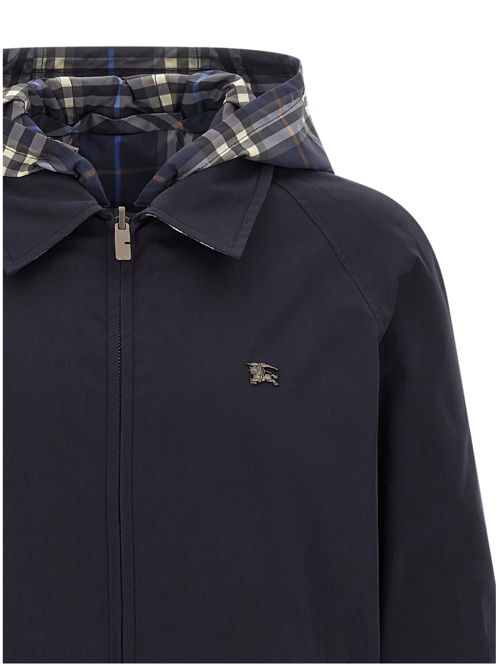 ‘Hodson’ reversible jacket in solid cotton and Burberry Check fabric, adjustable and removable hood, shirt collar, antiqued metal ‘Equestrian Knight Design’ logo and front zip closure, pockets, long sleeves with adjustable cuffs.