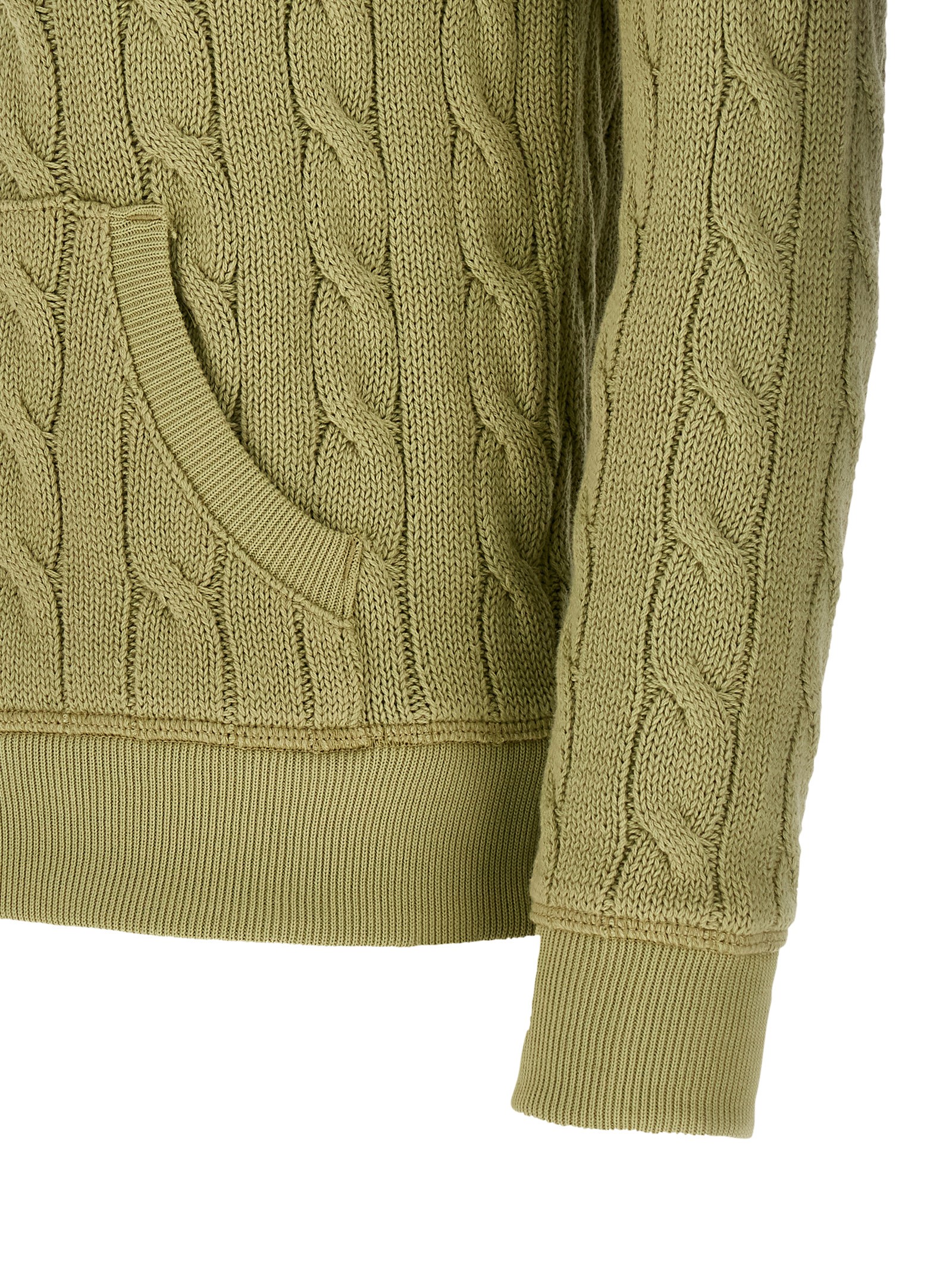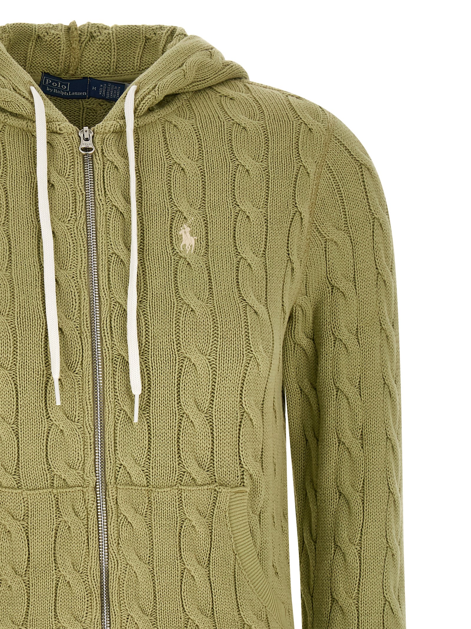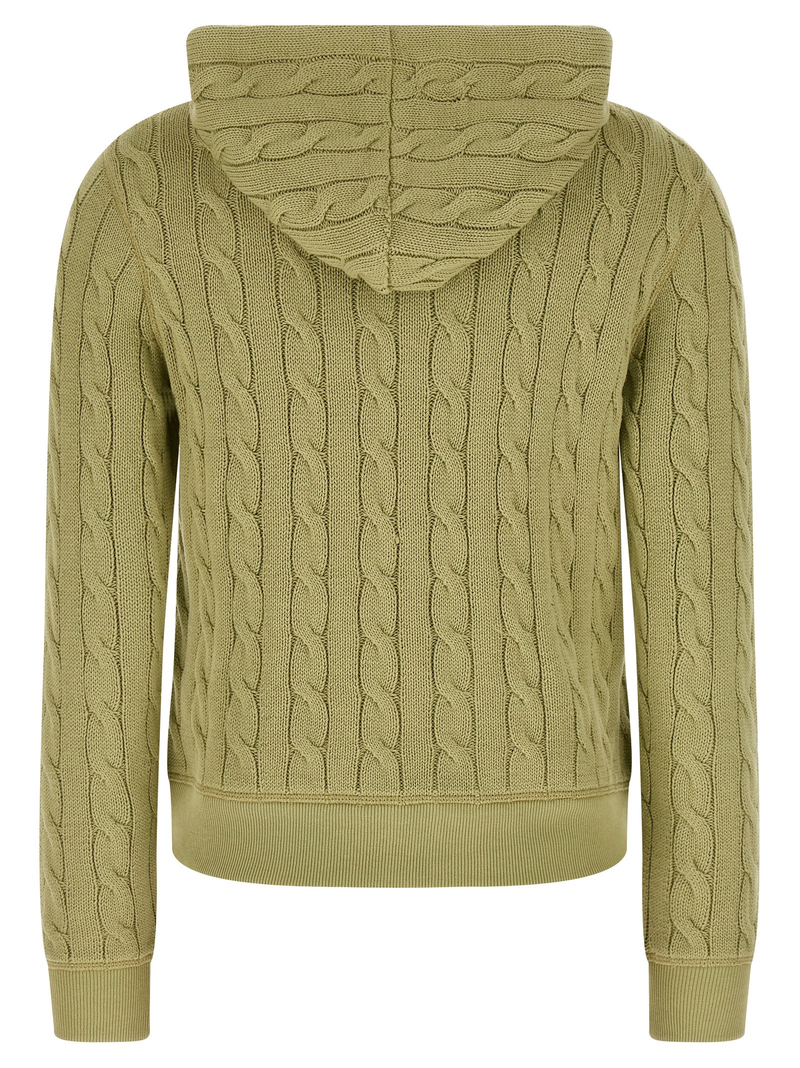 Pima cotton hooded cardigan with braided style, contrast logo embroidery and front zip closure, pockets, long cuffed sleeves, and headband on the hem.