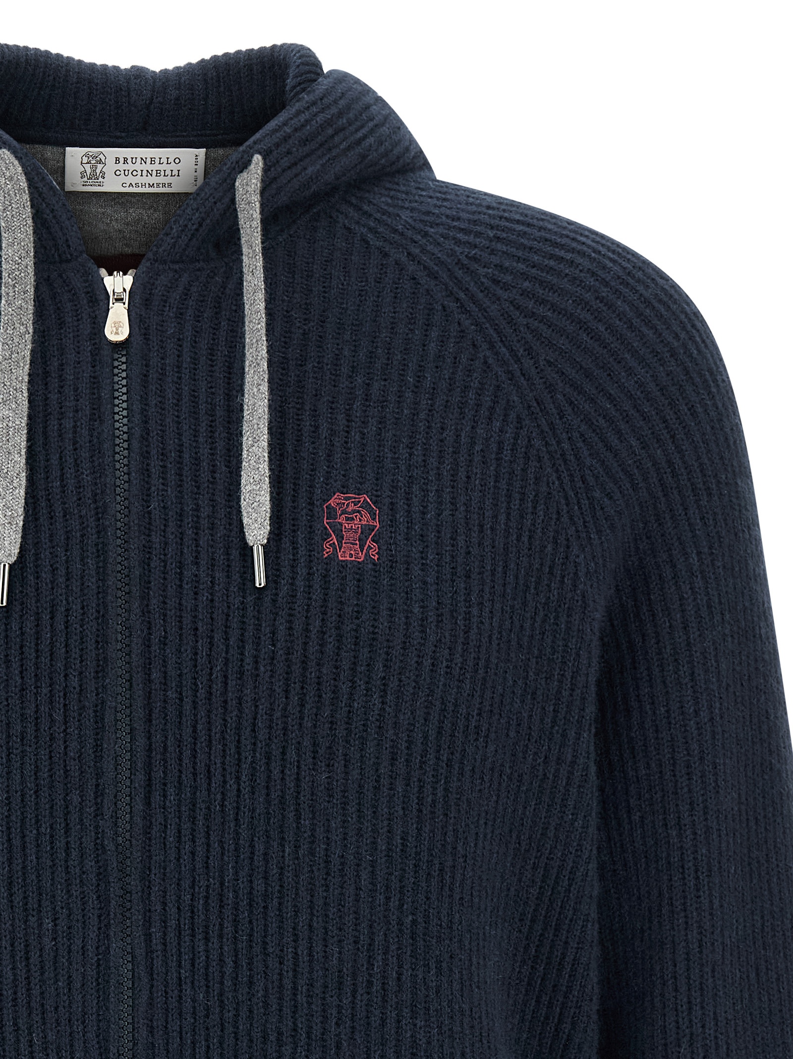 Cotton, cashmere and silk cardigan with English rib weave, adjustable hood, logo embroidery and front zip closure, pockets, long raglan sleeves with cuffs.