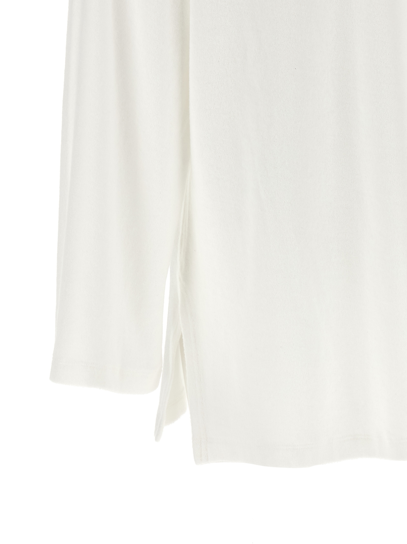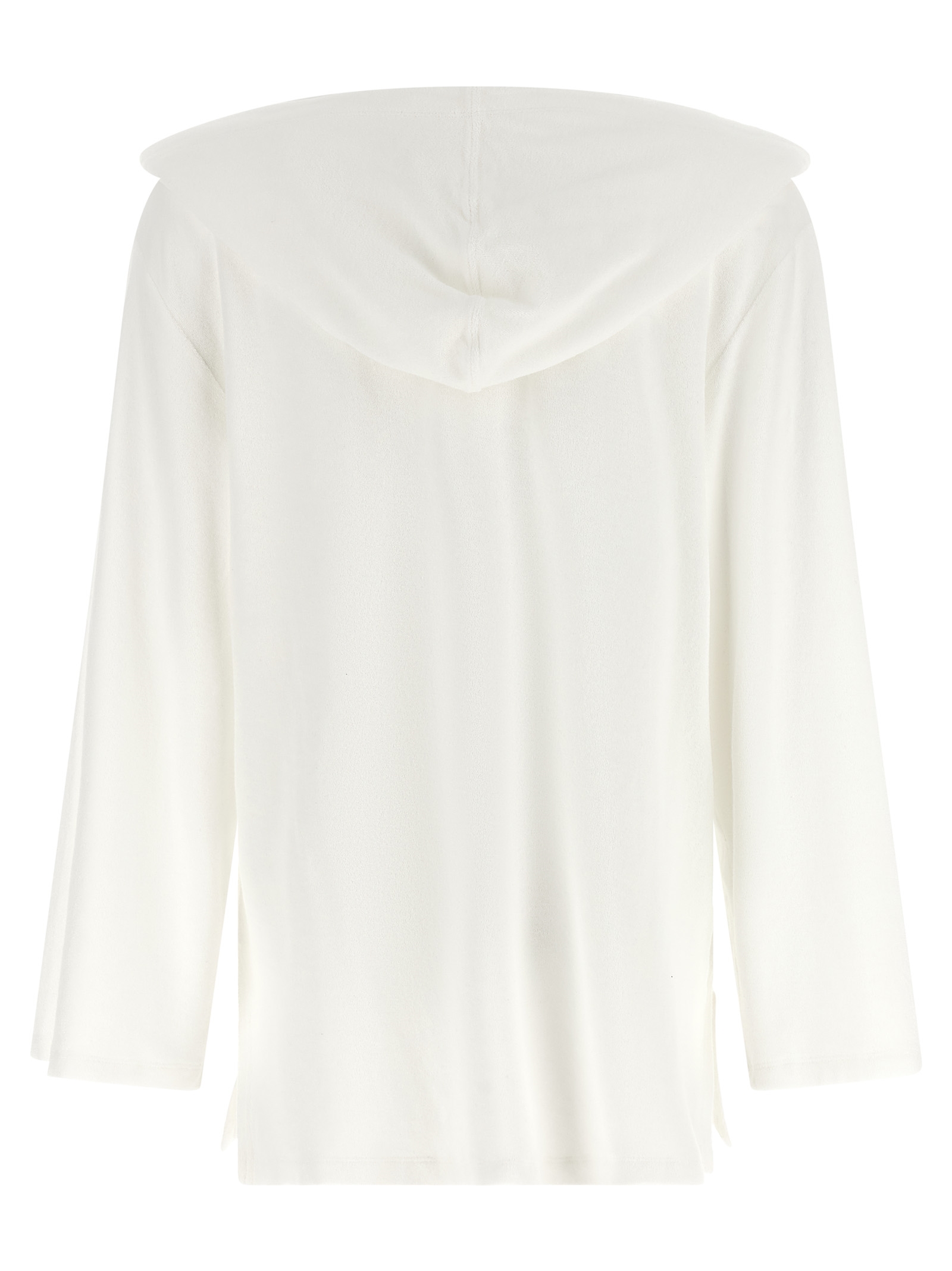 Cotton terry hooded sweater, slightly loose fit, V-neck, front logo embroidery, side slits, long sleeves.