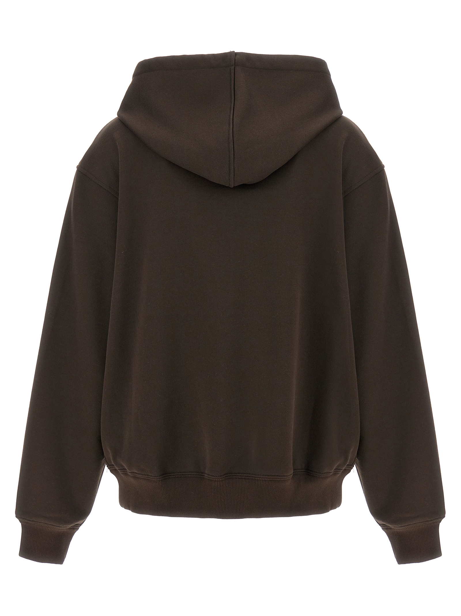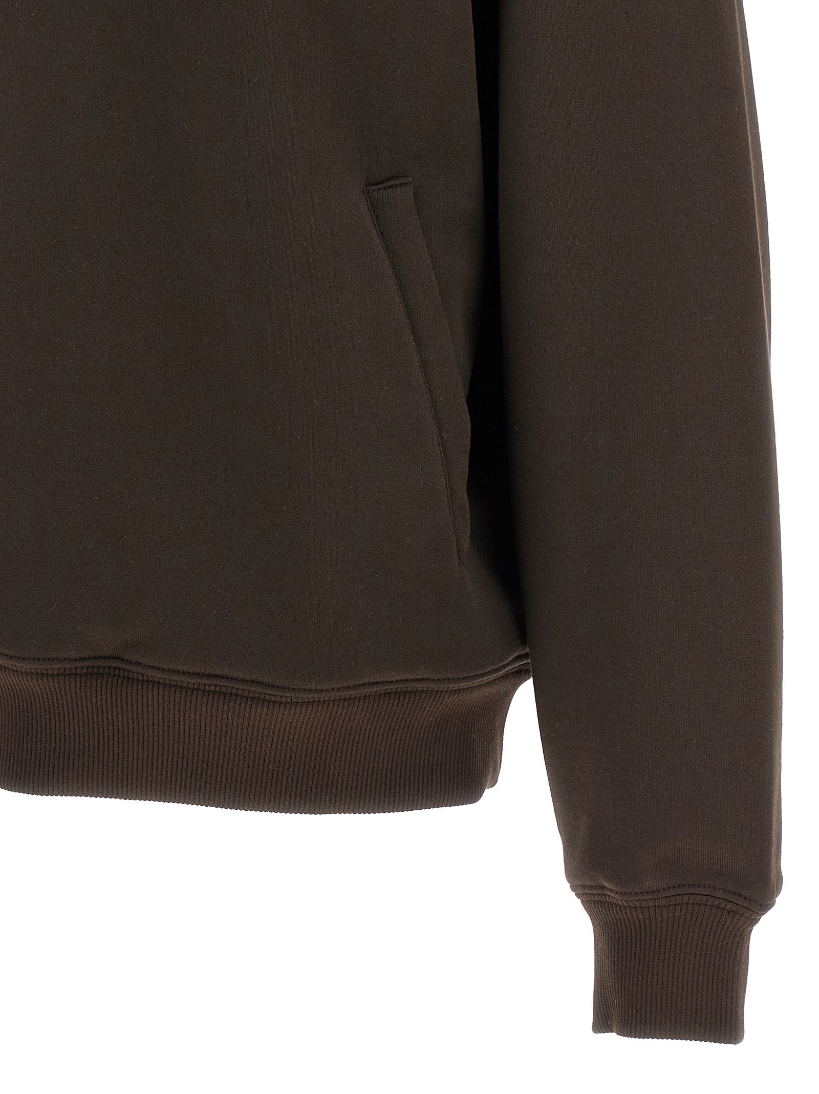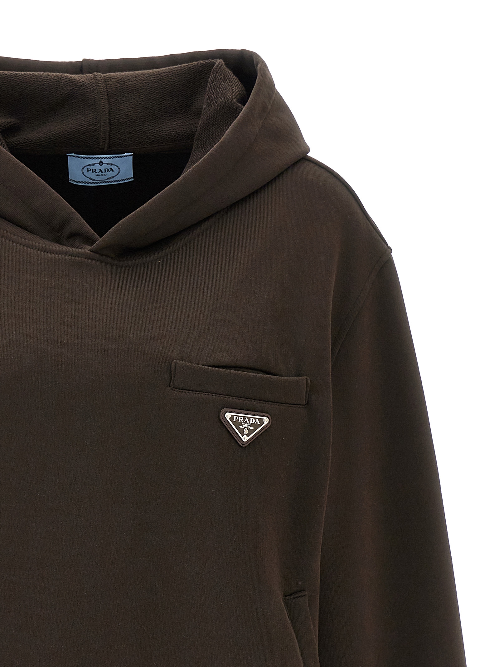 Cotton hoodie with hidden drawstring, front triangle logo, pockets, long sleeves.