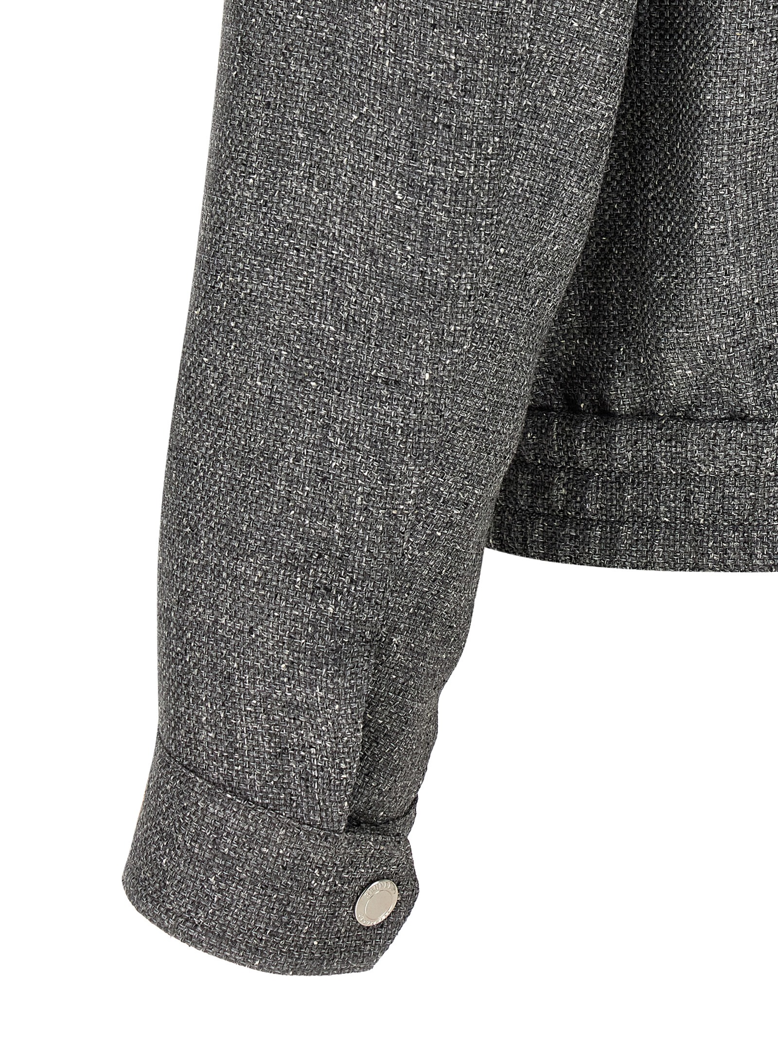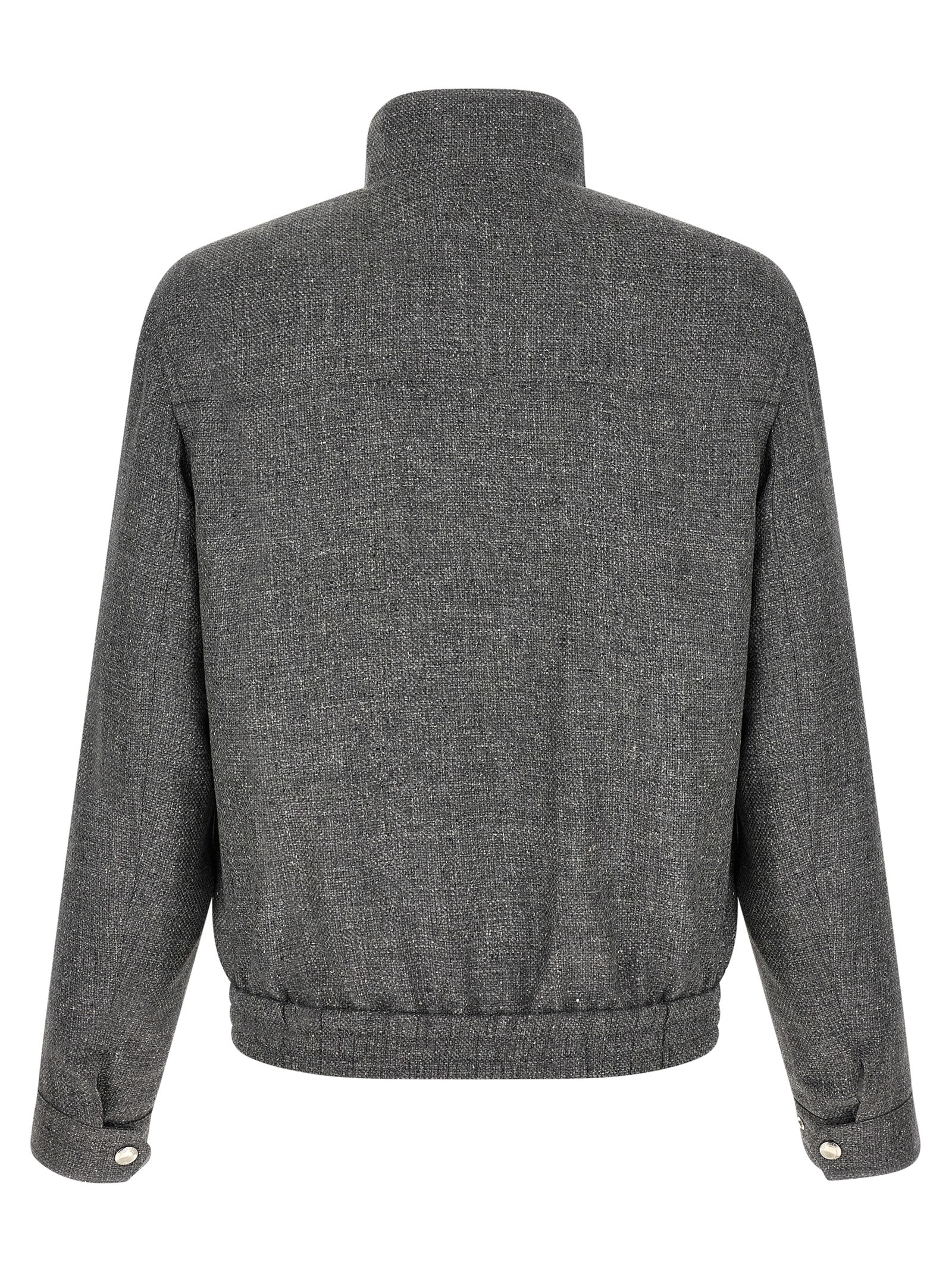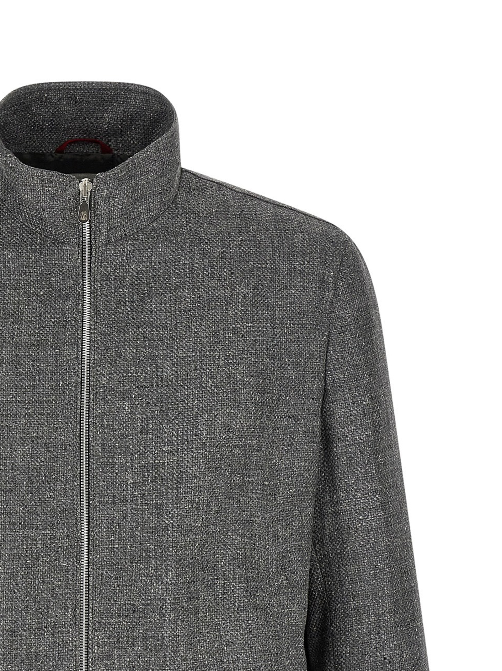 Silk, linen and wool hopsack jacket, an open-weave fabric with slightly flamed coloring, standing collar, front zip closure, low pockets with snap button, long sleeves with adjustable cuffs, elastic at the hem, half cupro lining, two inner pockets with button closure and pen pocket.