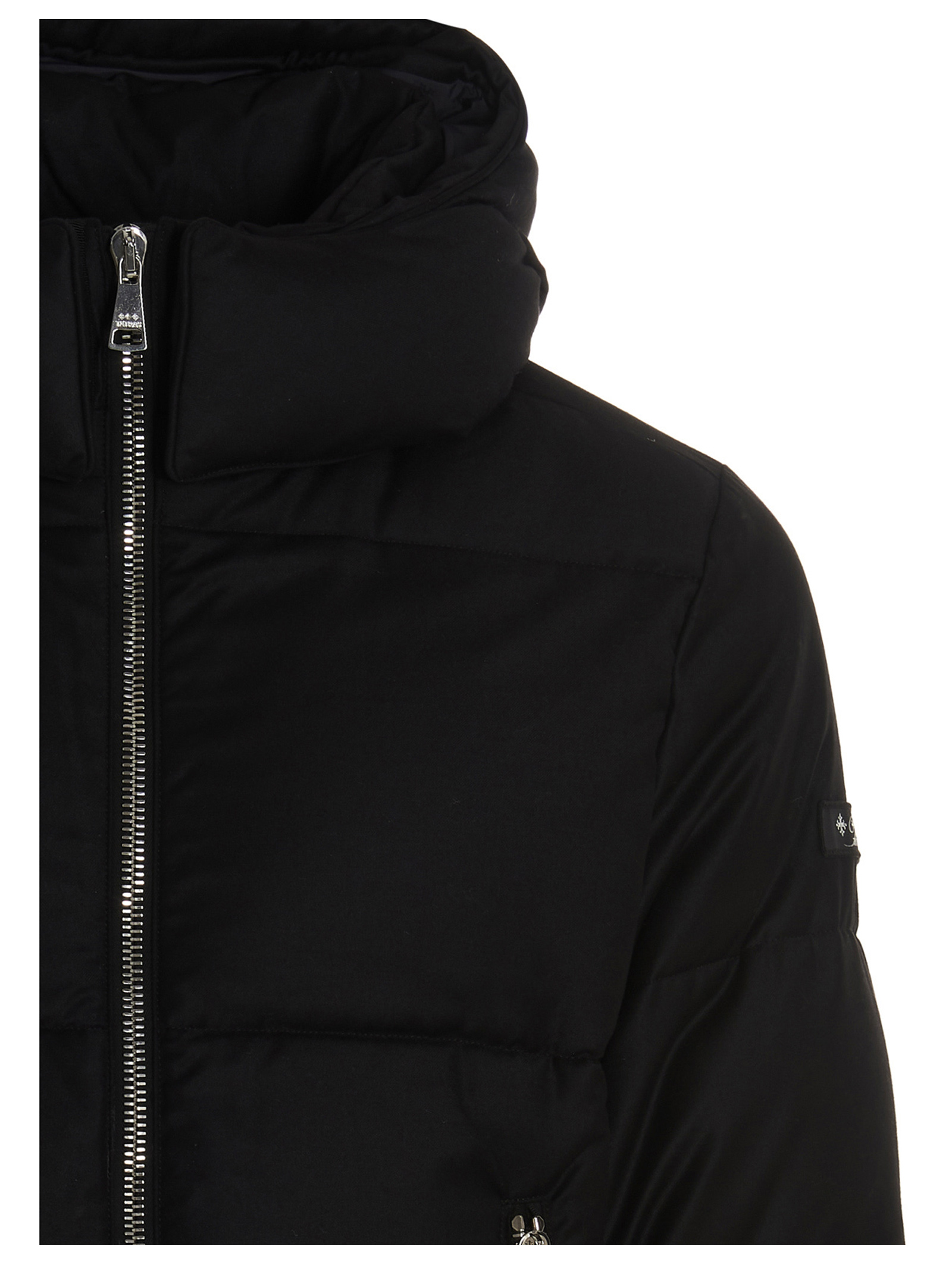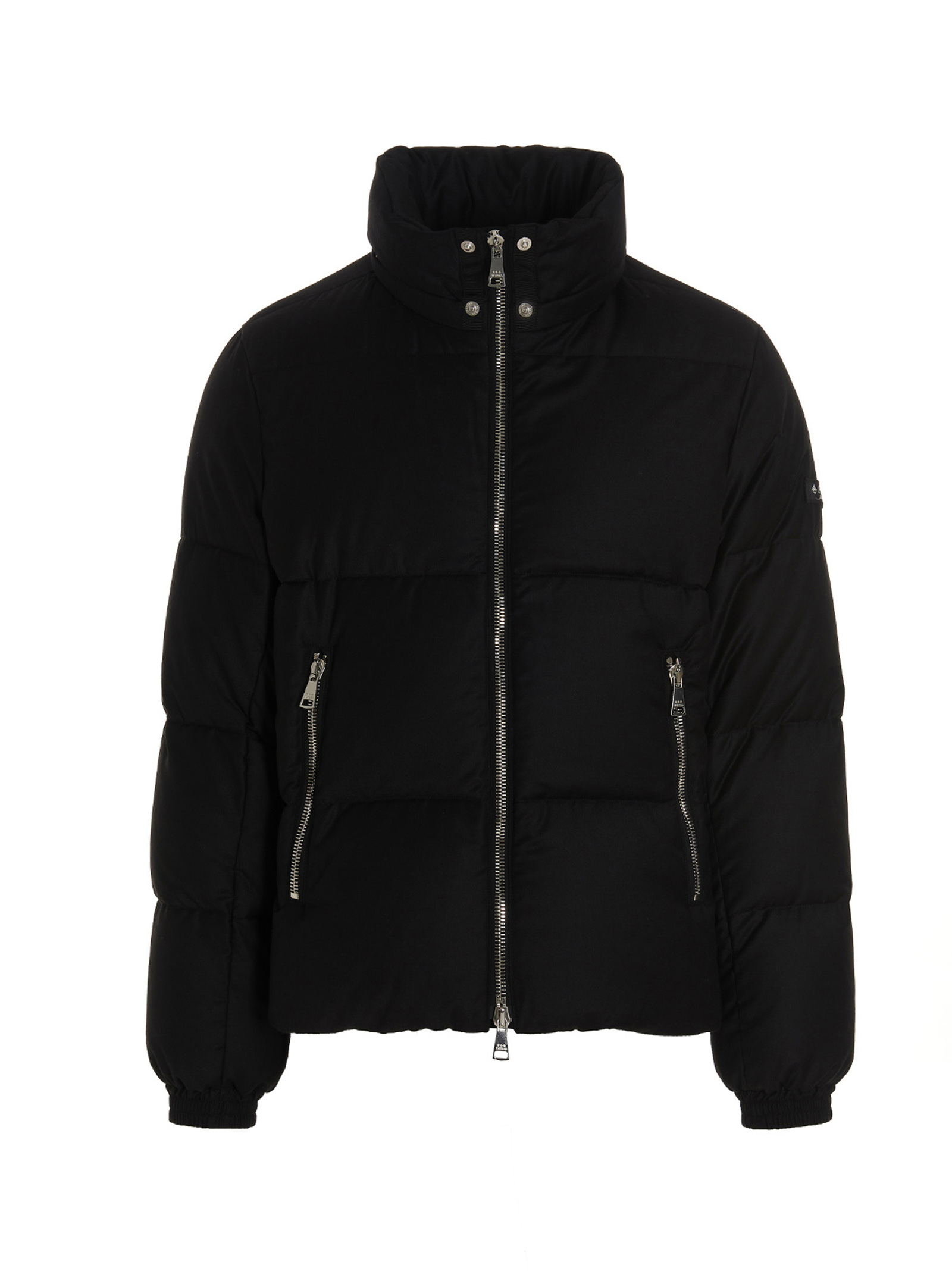 ‘Horn’ wool and silk blend down jacket with a zip, long sleeves, a logo patch, and goose down padding.