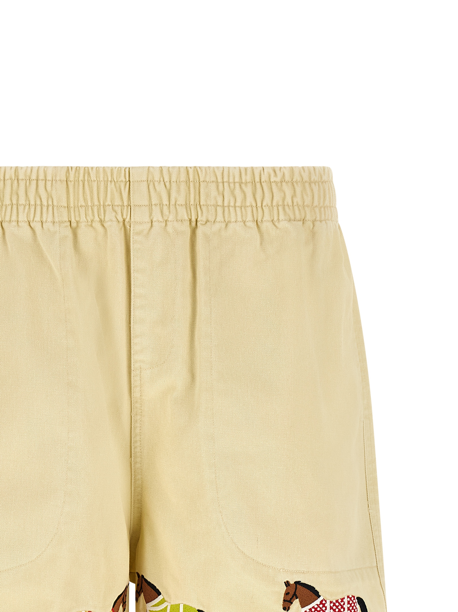 ‘Horse’ cotton twill bermuda shorts with embroidery on the leg bottom, flared leg, elastic waistband, pockets.