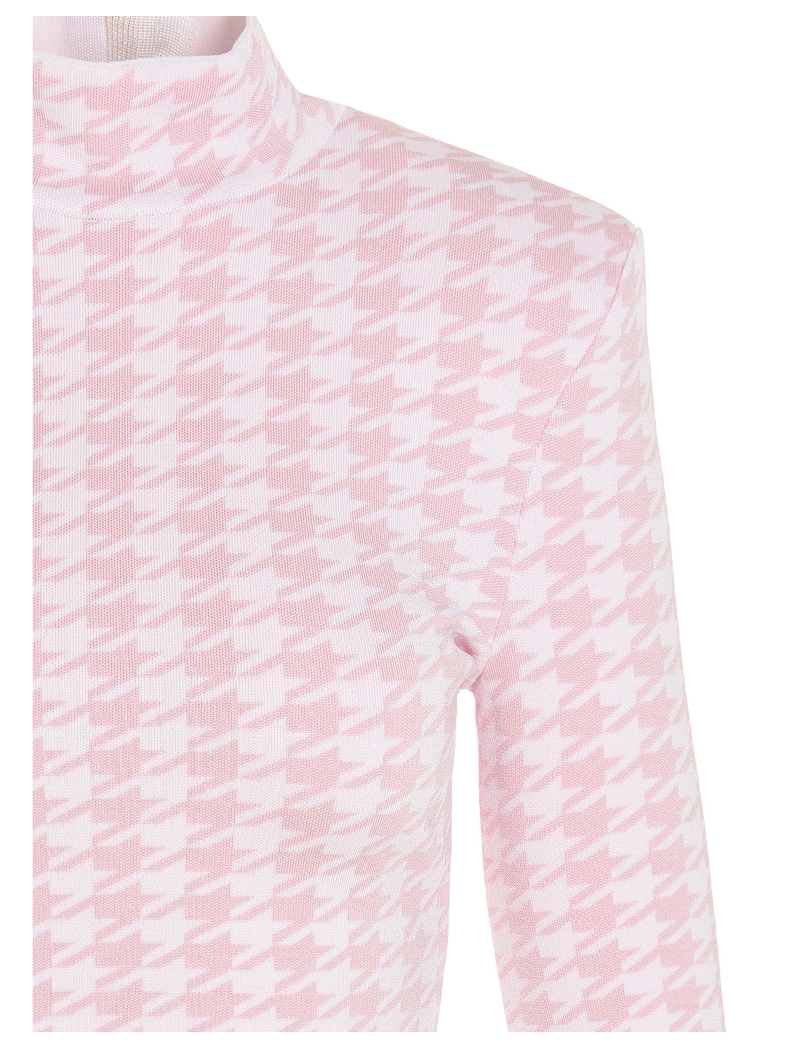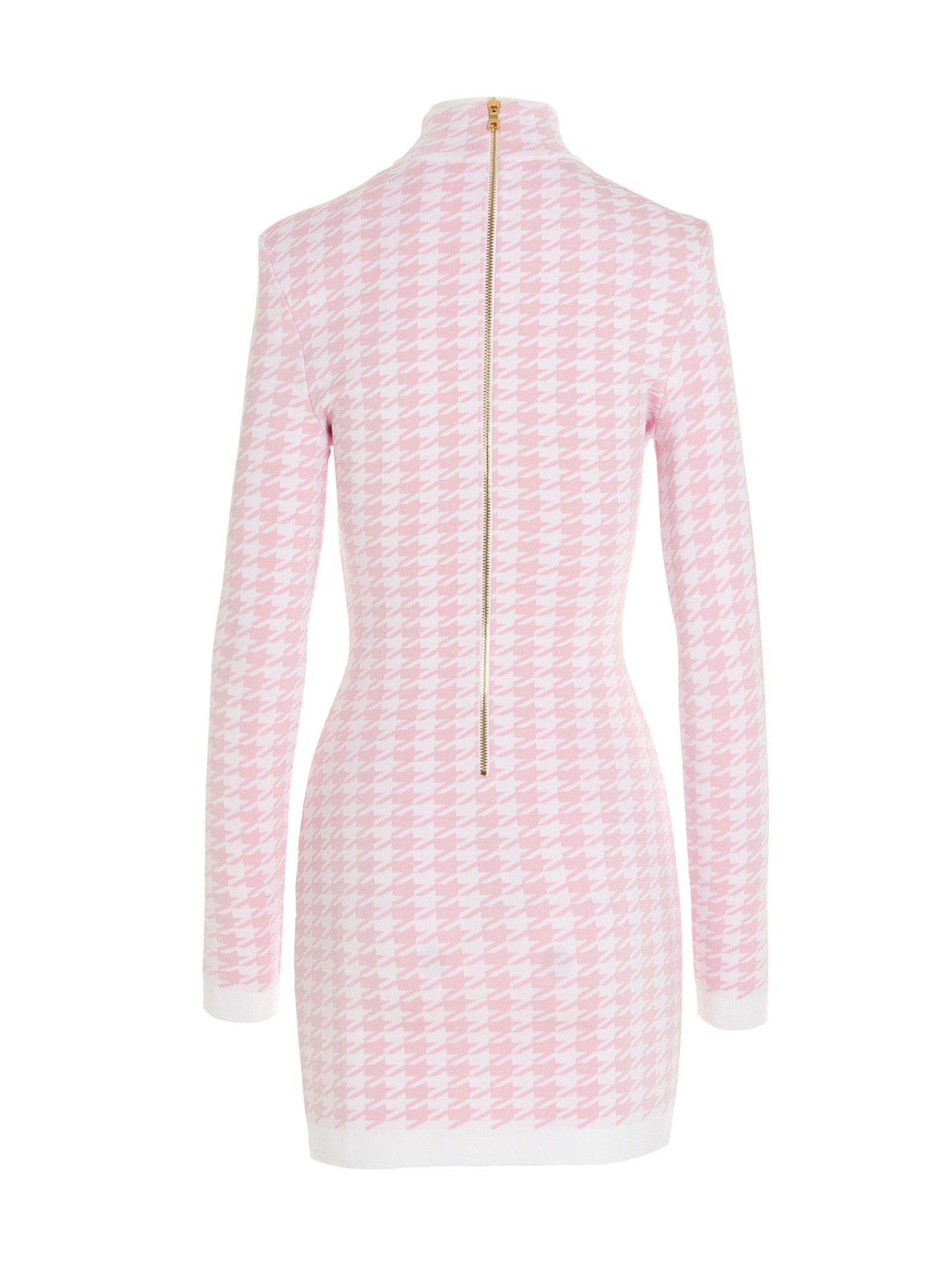 Houndstooth minidress with a mock neck, shoulder pads and a gold zip at the back.