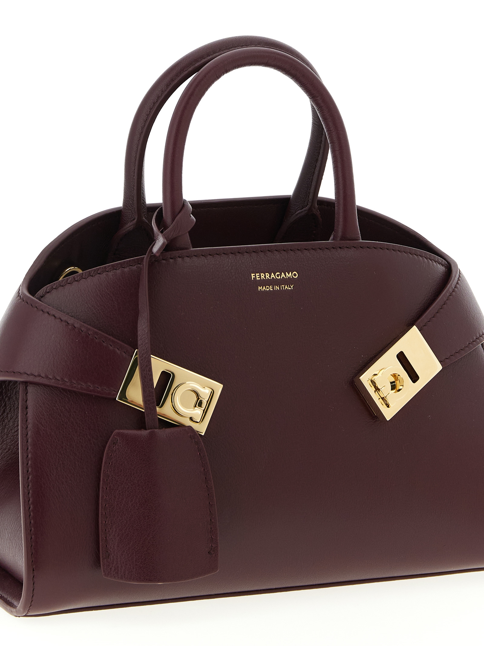 ‘Hug Mini’ leather handbag, embossed logo and front metal ‘Gancini’ buckle detail, double fixed handle, inner bitter closure, rigid base with metal feet, removable keyring, adjustable and removable shoulder strap