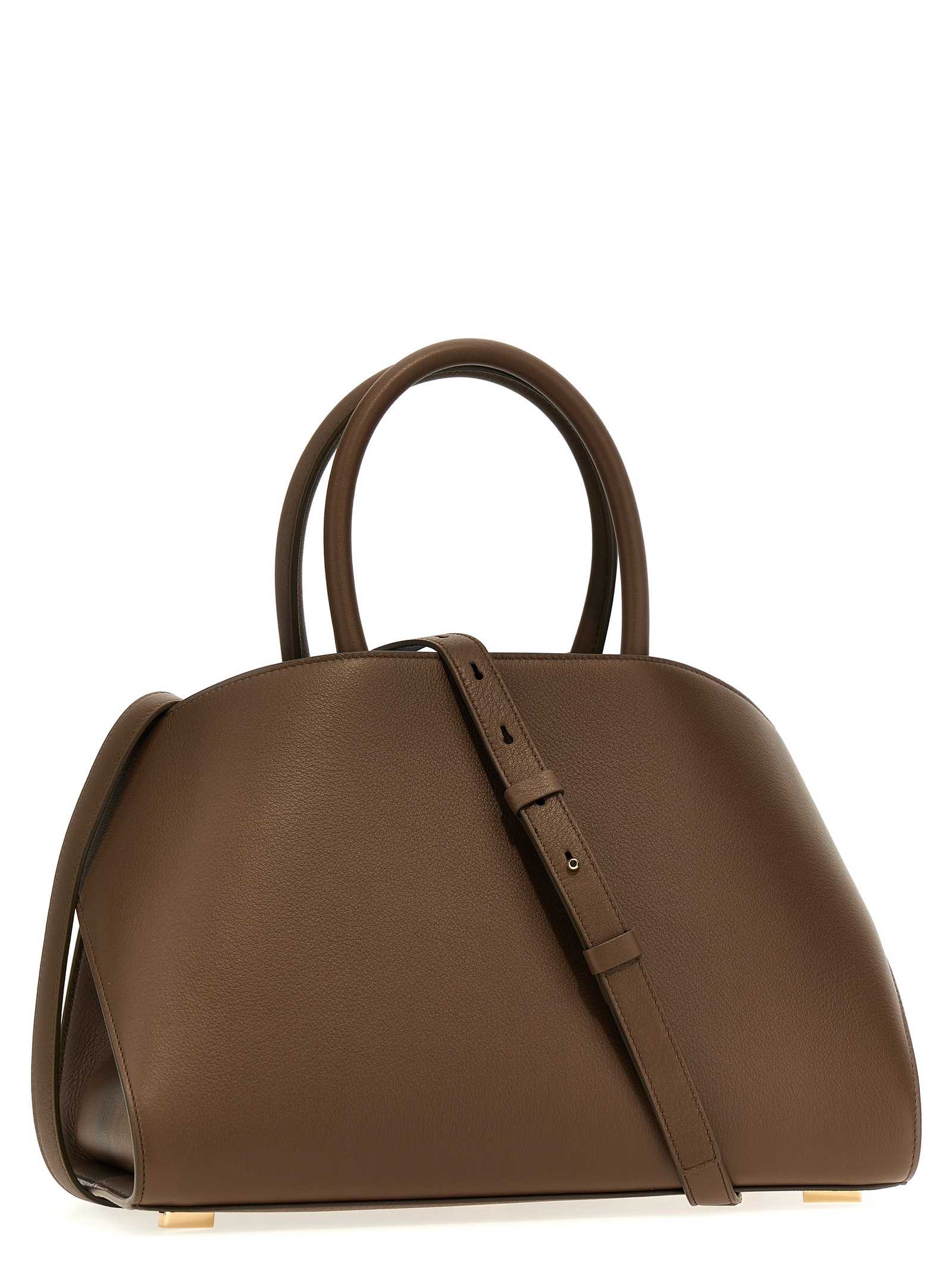 Small ‘Hug (S)’ leather handbag with side buckles, featuring a removable and adjustable shoulder strap.