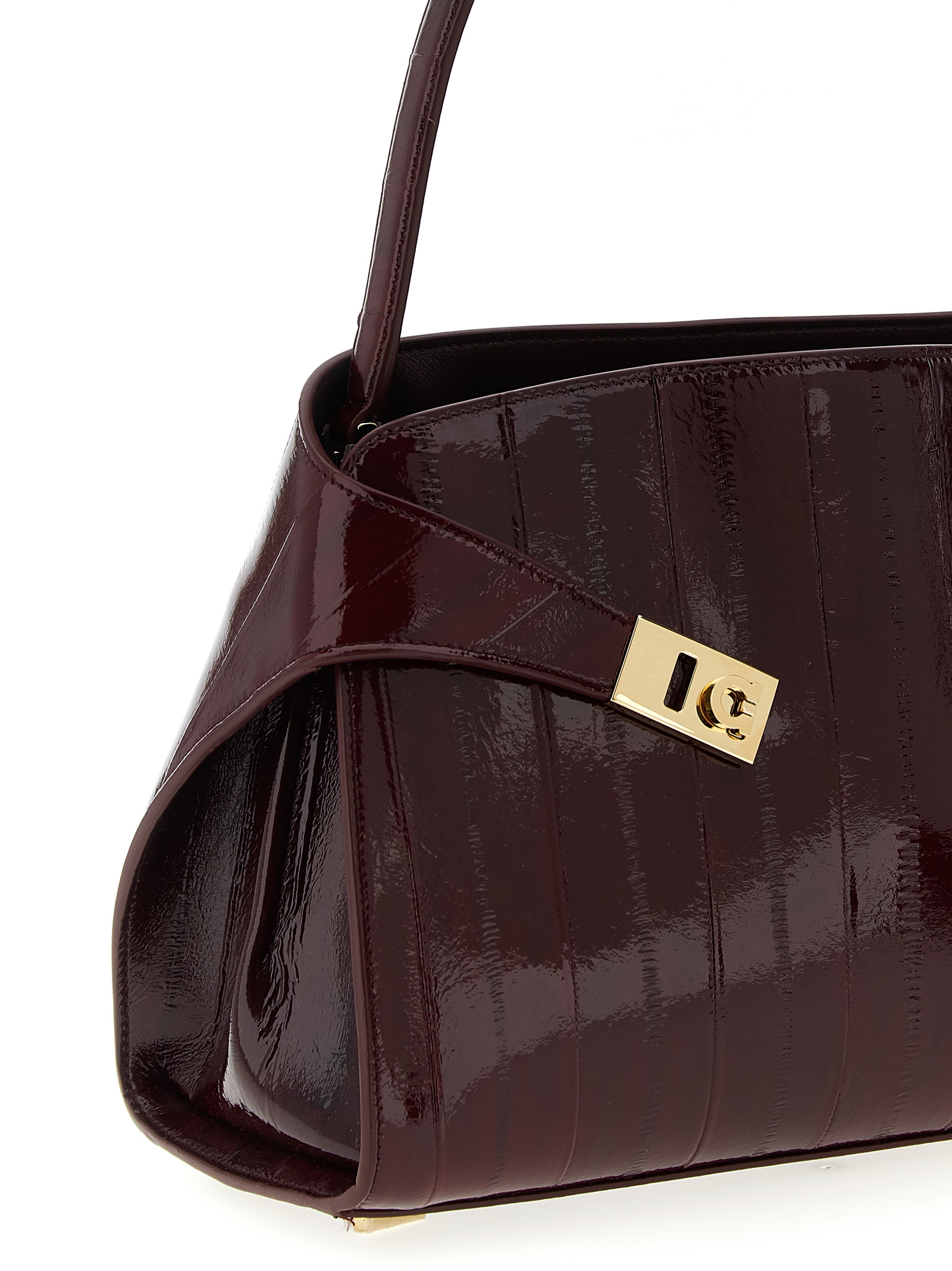 ‘Hug Soft (M)’ shoulder bag in shiny eel leather, dial construction, front embossed logo, side gussets with Gancini buckle decoration, inner flap closure with magnets and T-bar, fixed handle, metal details.