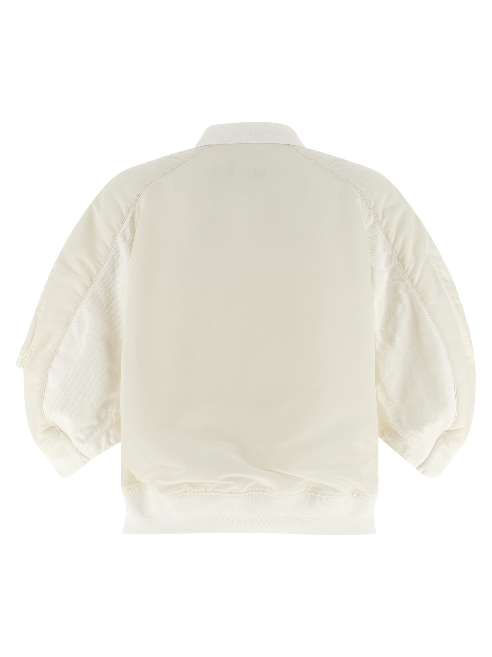 Hybrid bomber jacket consisting of a garment-dyed cotton denim front, shirt collar, front button closure, pockets and back in tone-on-tone nylon twill, short raglan sleeves with dropped cuffs and shoulder, and a band on the bottom of the garment.