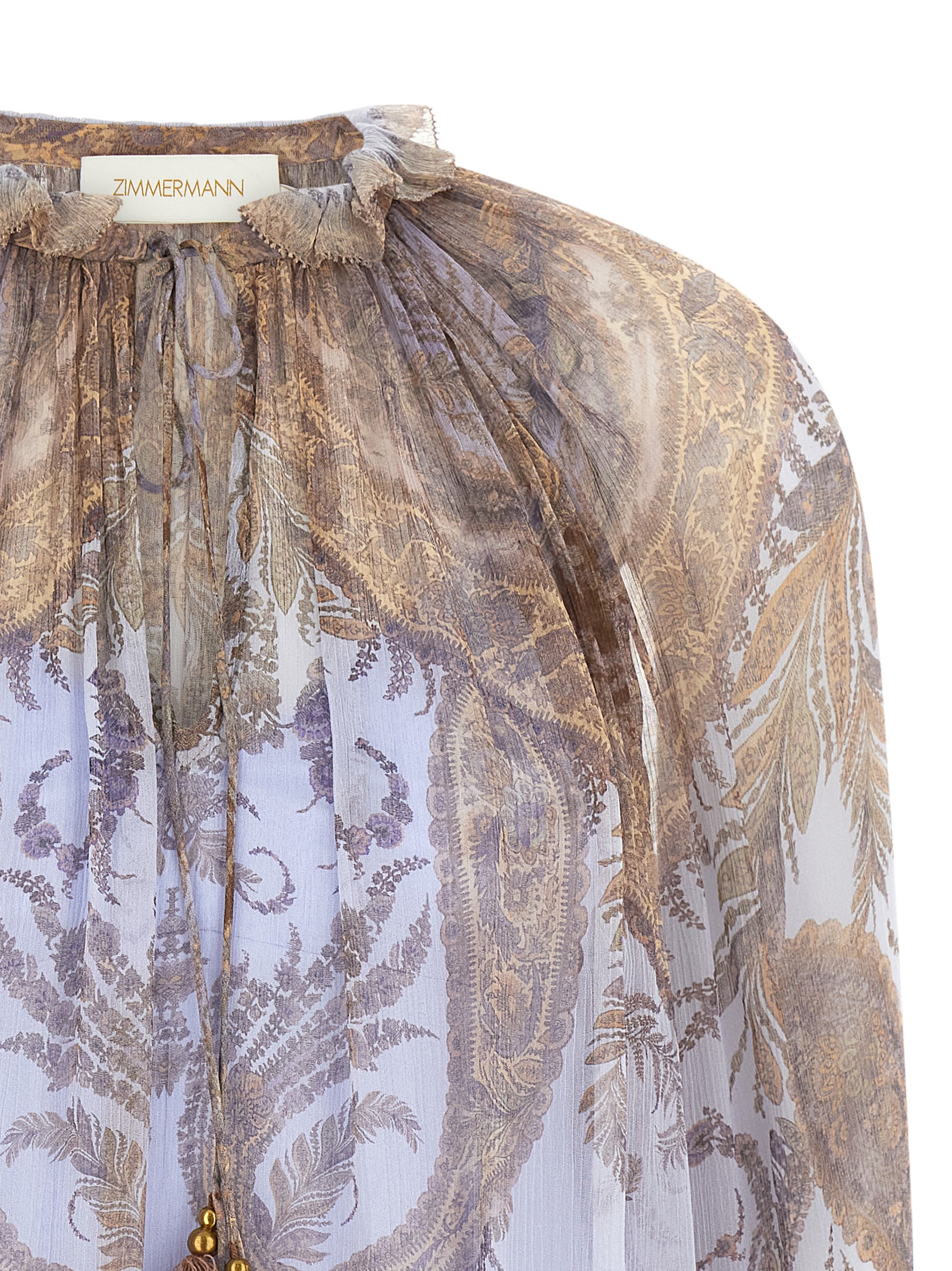 ‘Hypnotic Billow’ blouse in light viscose ‘Lilac Paisley’ print, standing collar with curl, V-neck with drawstring, long puff sleeves with elasticated cuffs, removable top with adjustable straps.
