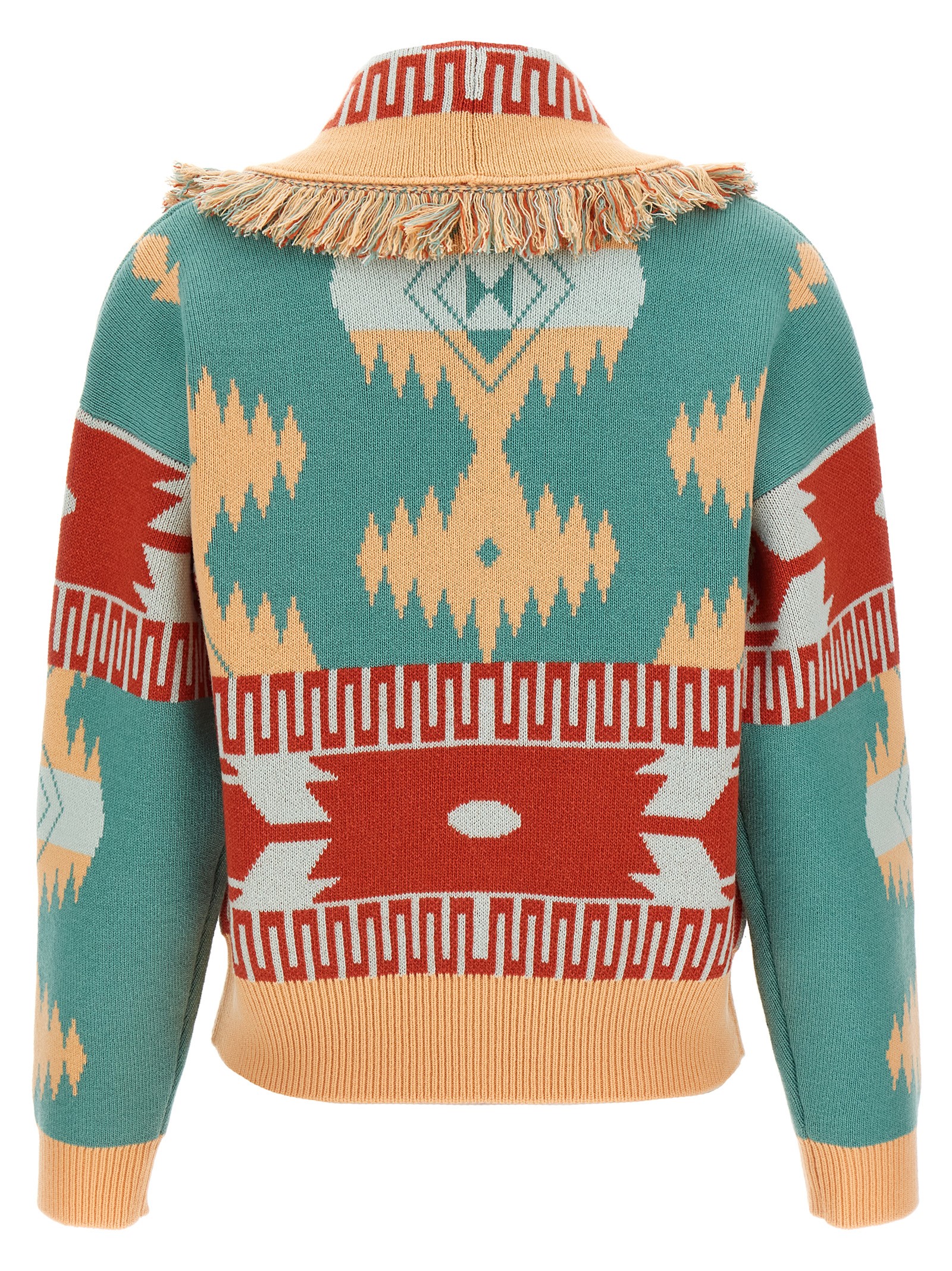 Cashmere and virgin wool cardi-bomber jacket with double jacquard ‘Alanui’ pattern, bomber cardigan, shawl collar with fringes, front button closure, long sleeves with cuffs and dropped shoulder.
