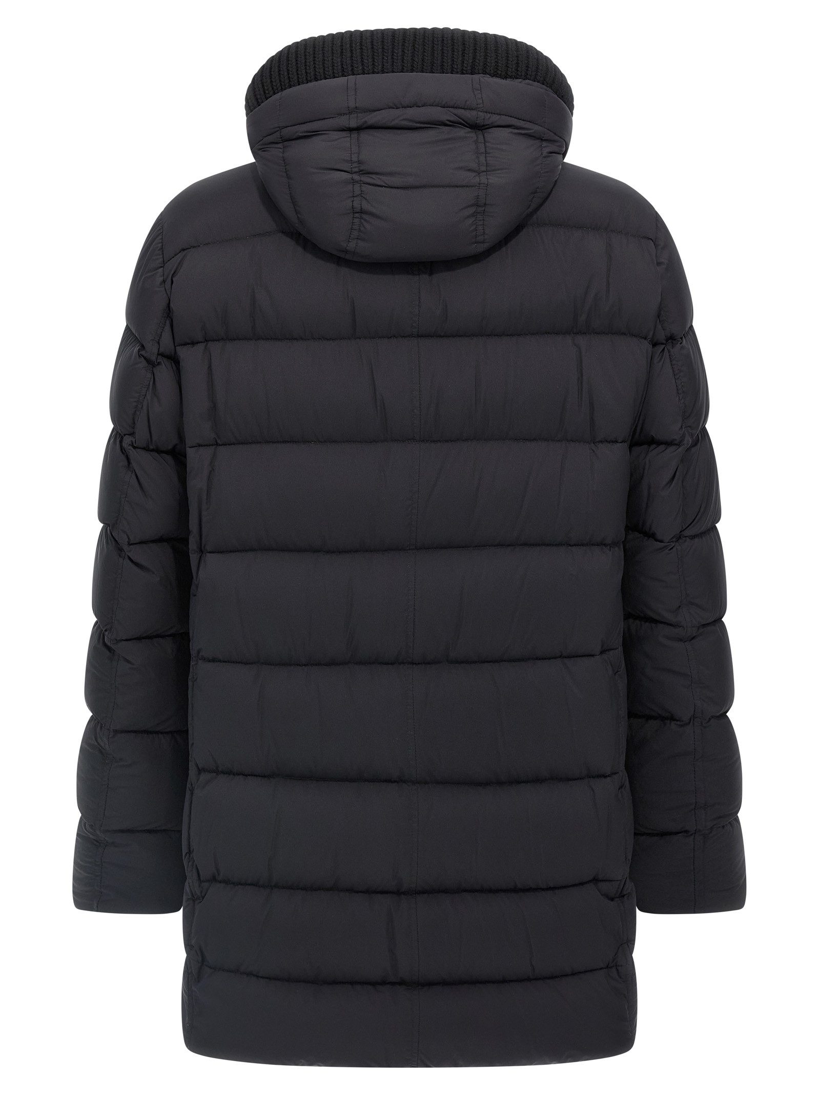 Long ‘Il Parka’ nylon microfiber down jacket slightly waterproof goose down padding, removable hood with removable stretch ribbed knit detail, front zip and snap button closure, pockets, long sleeves.
