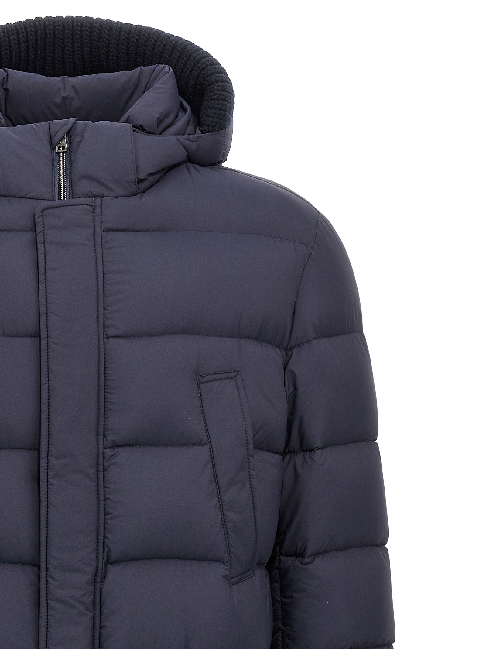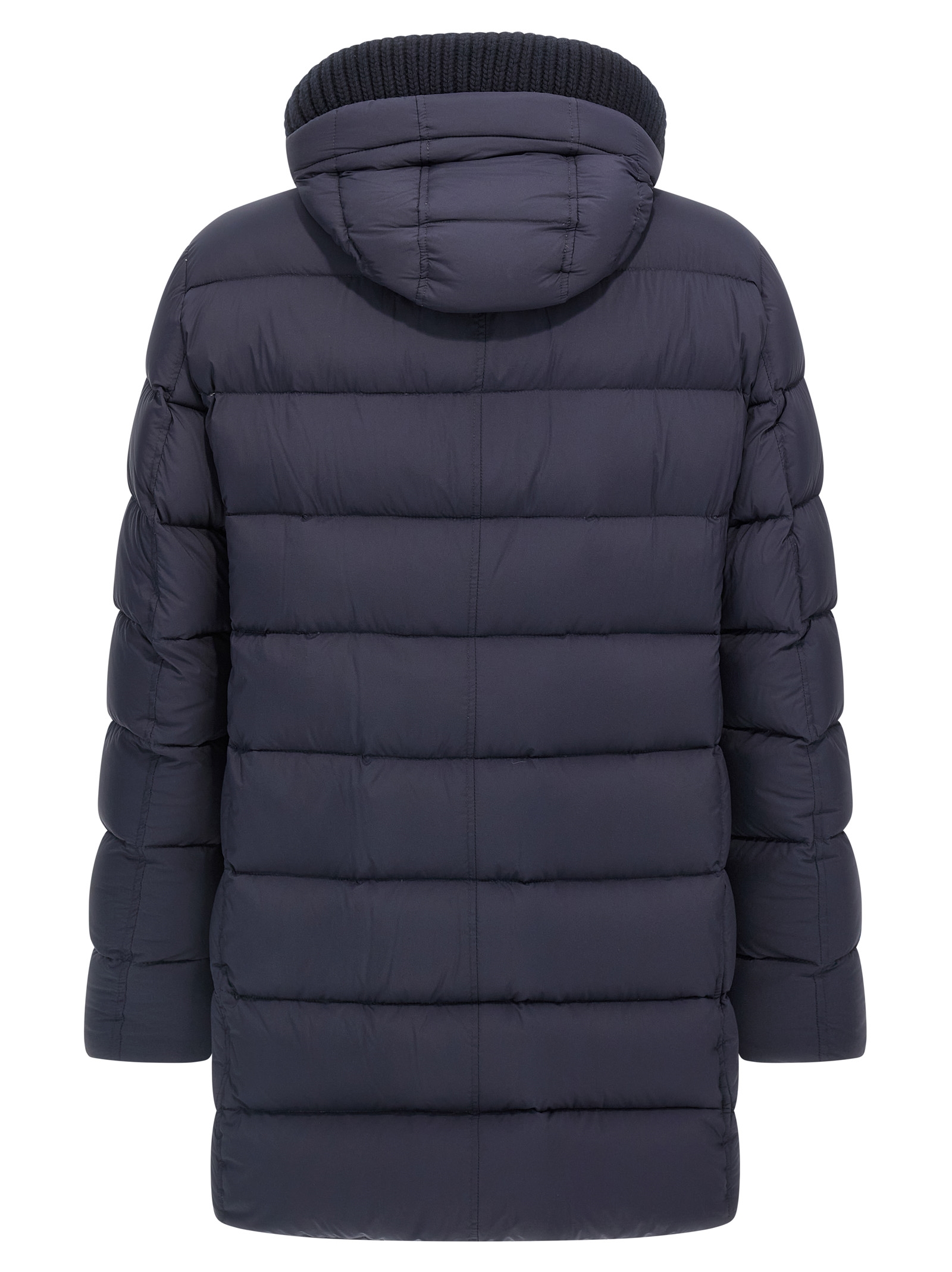 Long ‘Il Parka’ nylon microfiber down jacket slightly waterproof goose down padding, removable hood with removable stretch ribbed knit detail, front zip and snap button closure, pockets, long sleeves.