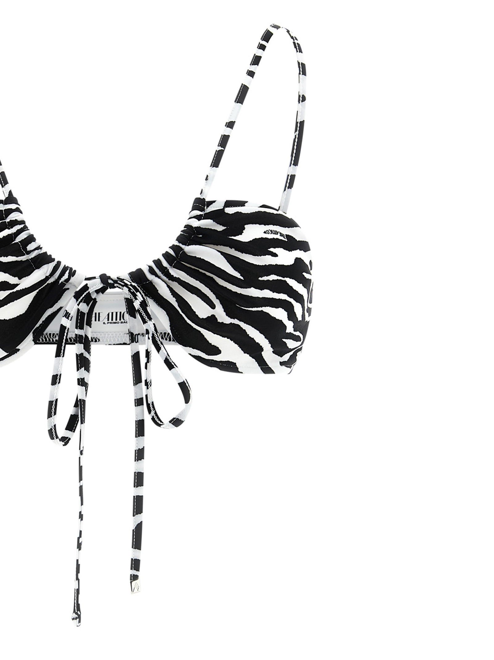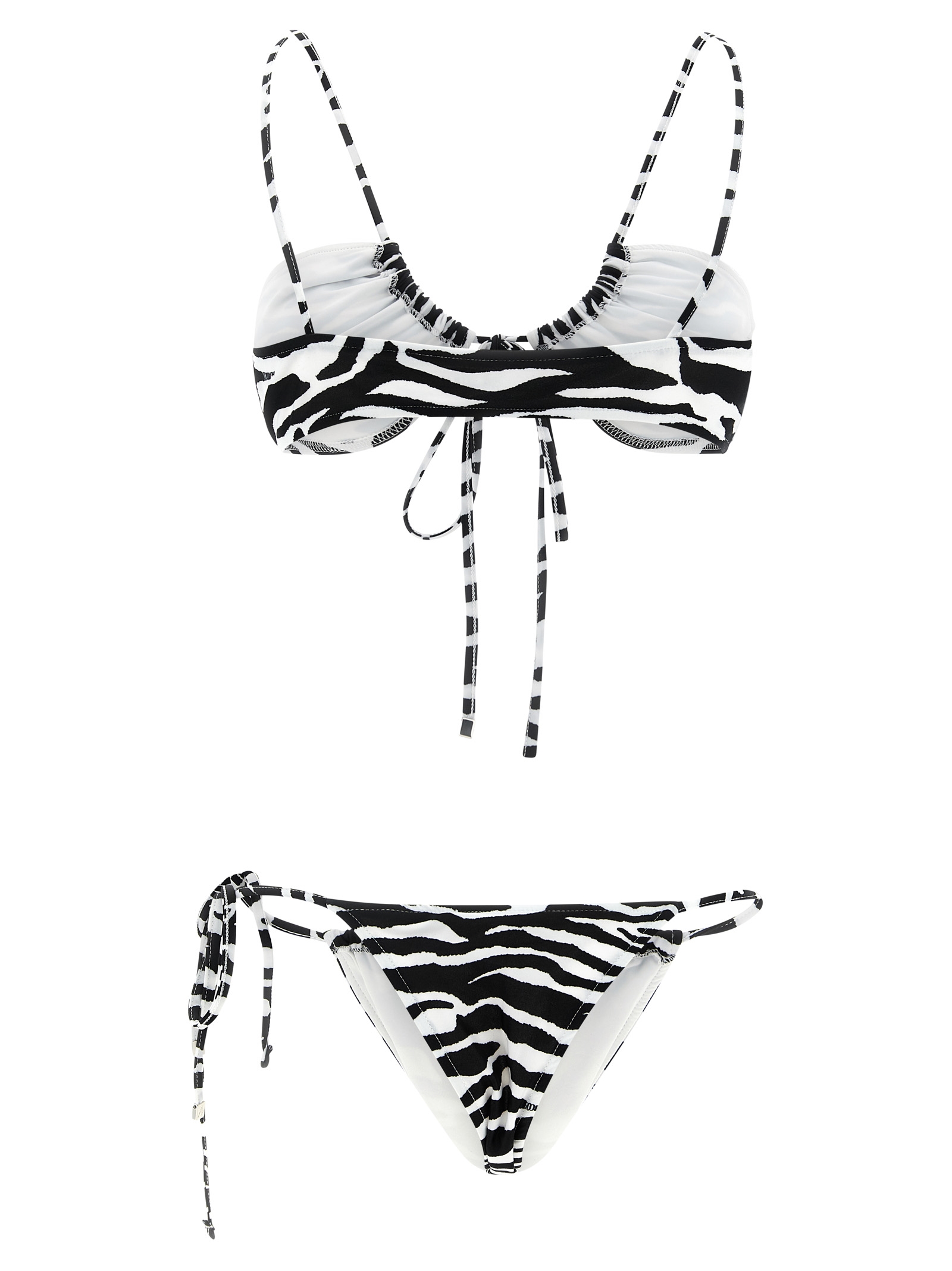 ‘Il Primo Bagno’ all-over animalier print lycra bikini, lacing with final metal details with engraved logo, crossed triangle top on the front with lace to tie as desired, thong briefs with lace on the left side, low waist.