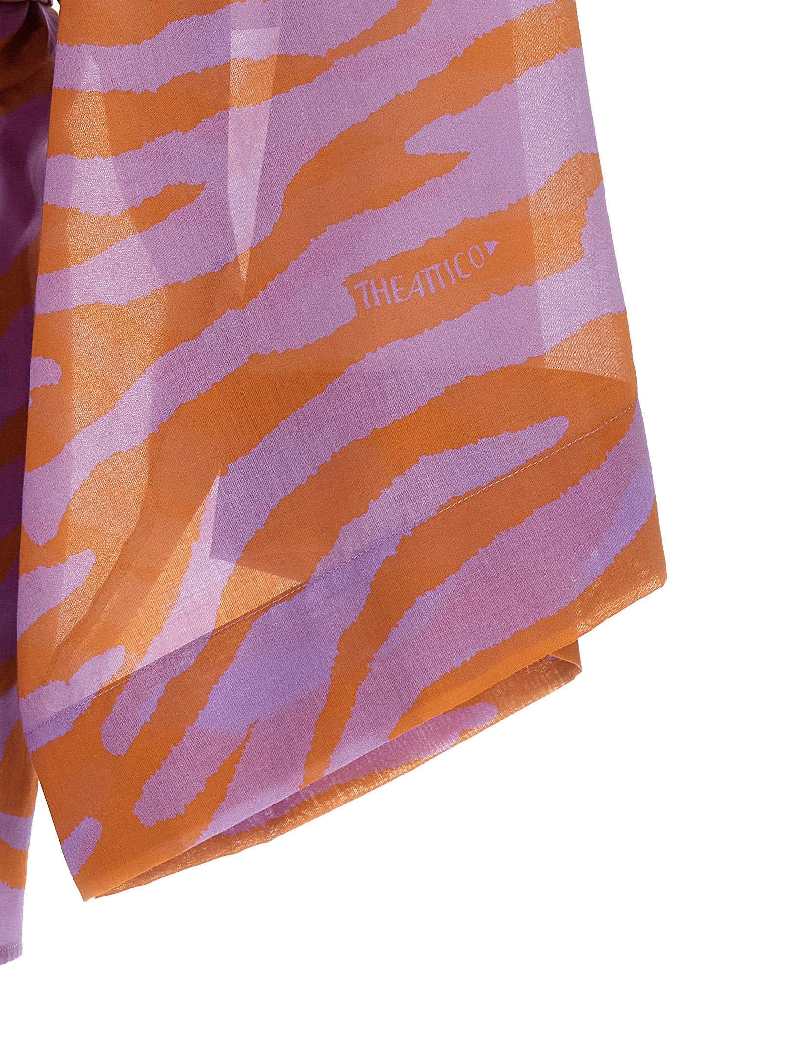 ‘Il Primo Bagno’ mini dress in light all-over animal print cotton muslin, chemiser model with sarong skirt to tie as desired, V-neck, front button closure, long wide sleeves with dropped shoulders and flared sleeve bottoms.