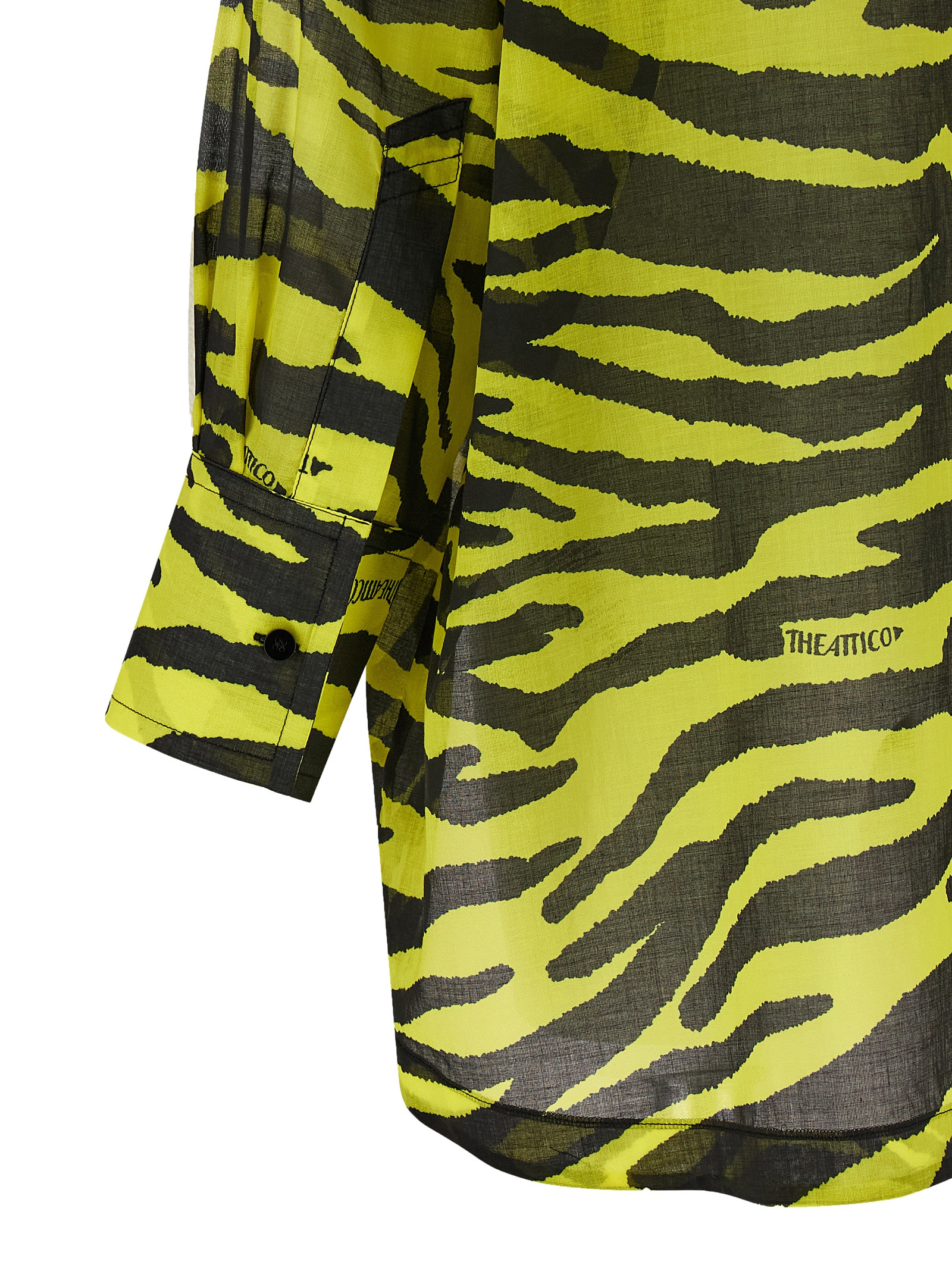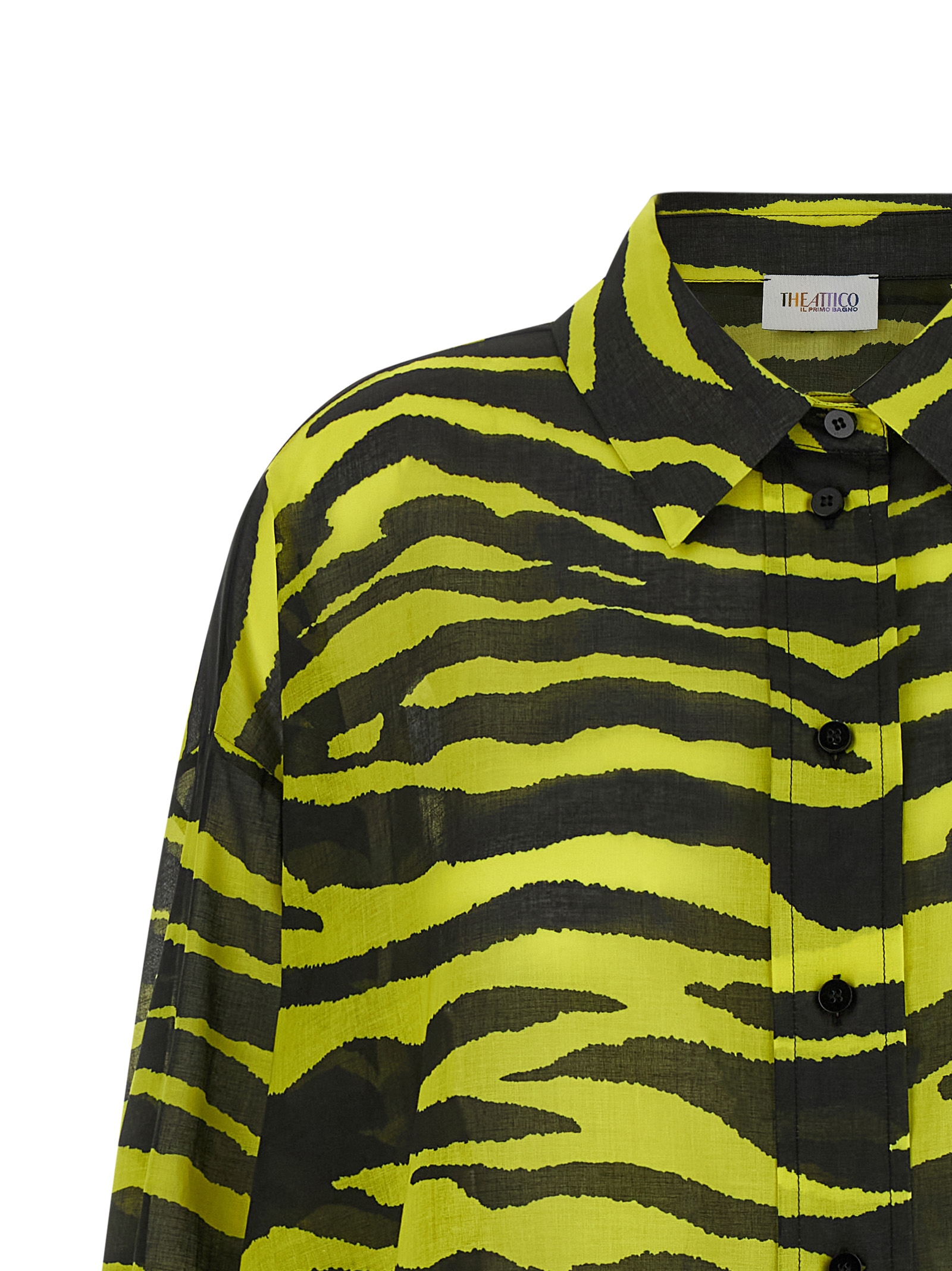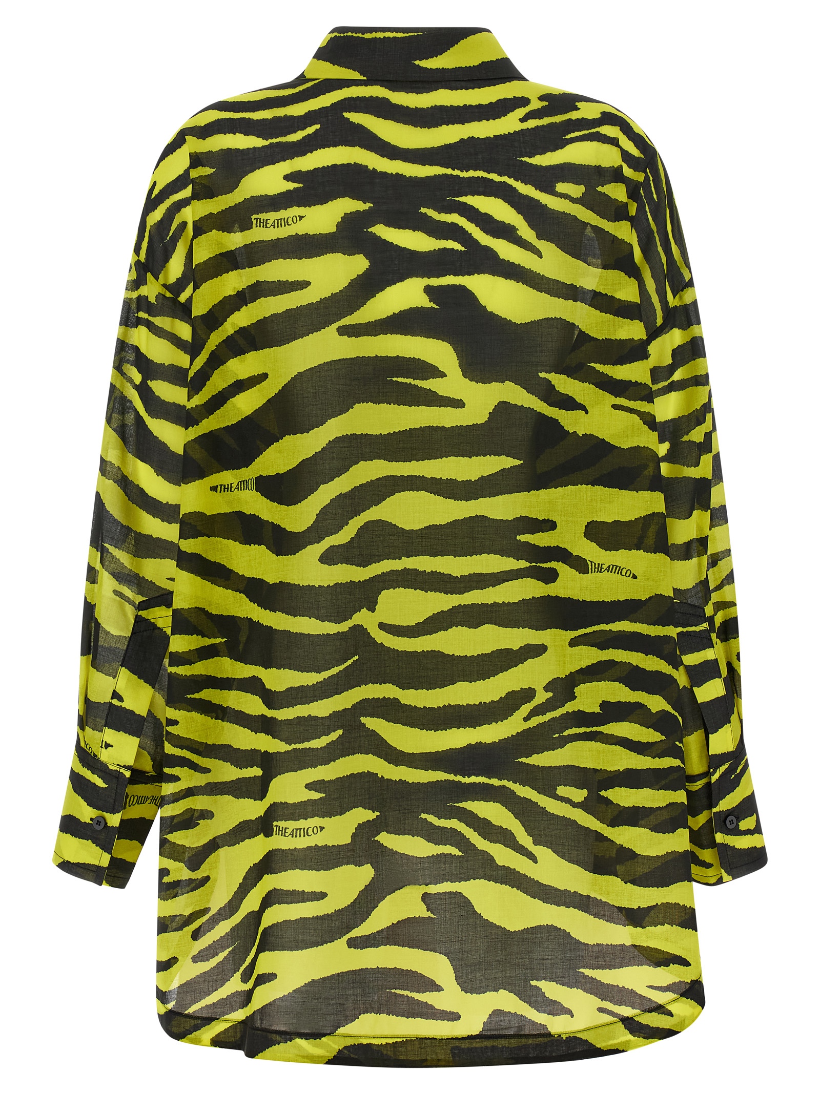 ‘Il Primo Bagno’ shirt in light all-over animal print cotton muslin, front button closure, long sleeves with cuffs and dropped shoulders, front shaped split, back rack with cannon pleats, asymmetrical hem.