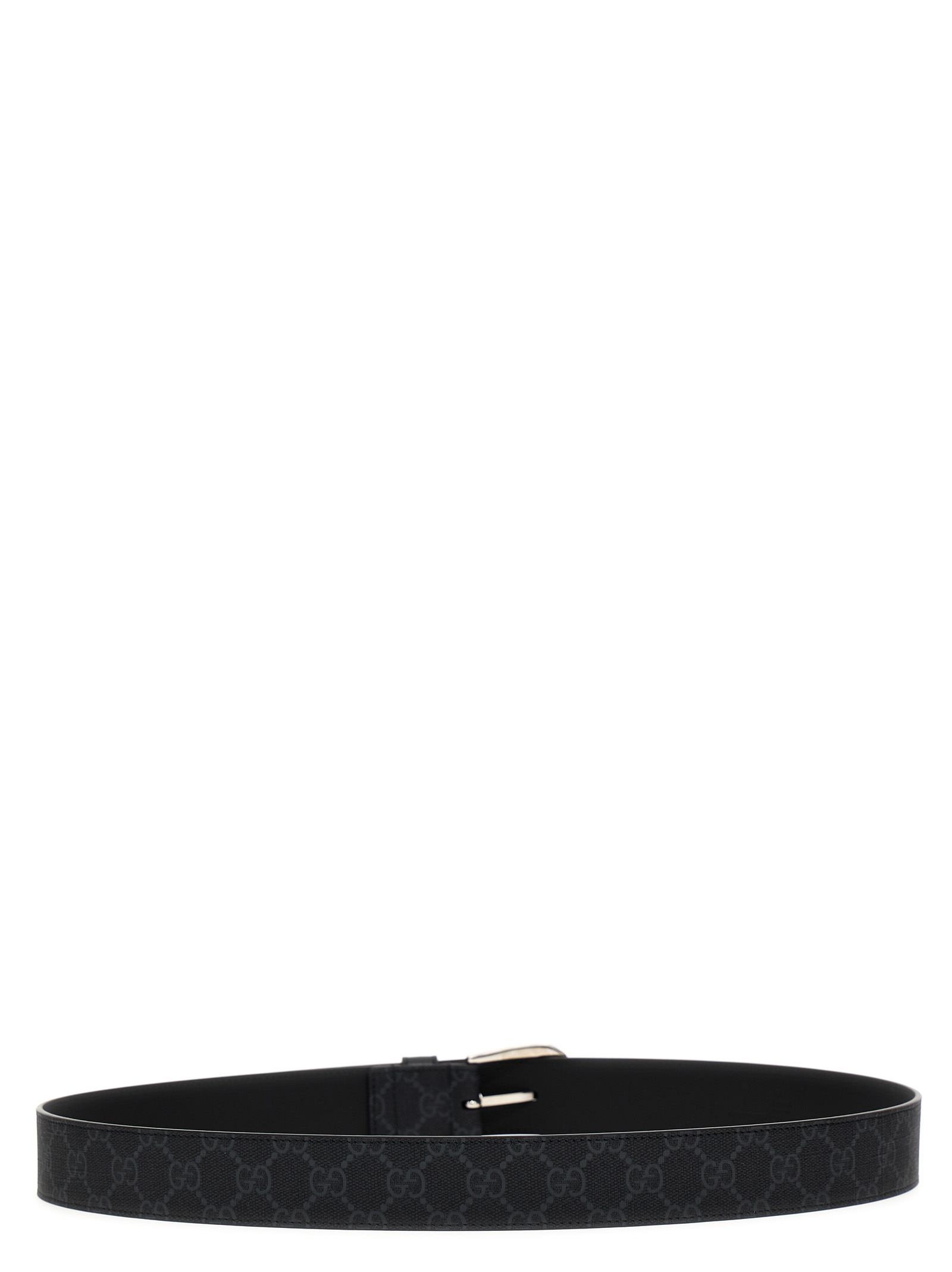 Belt in black GG Supreme fabric with black leather details, square buckle, and overlapping GG detail.