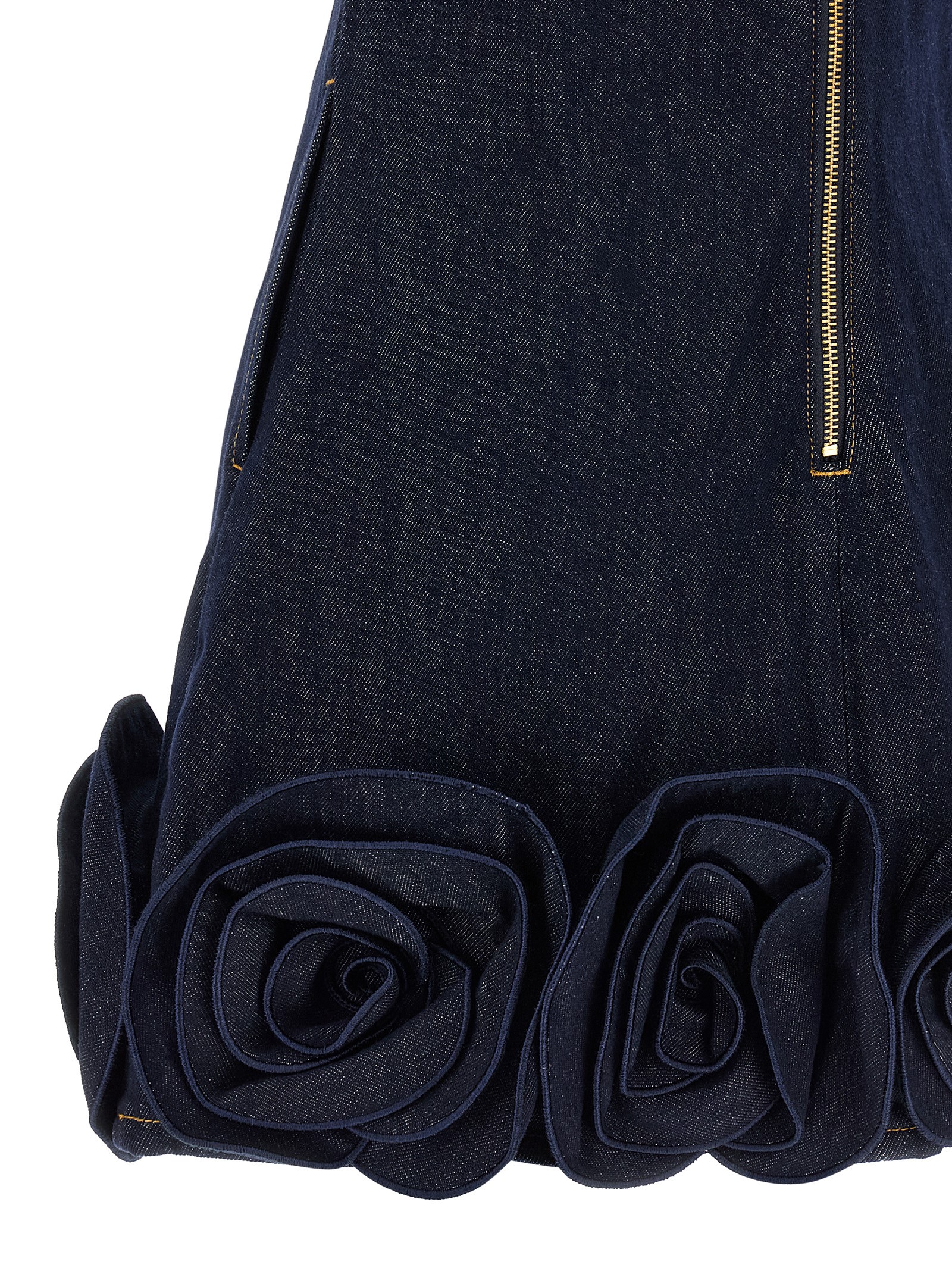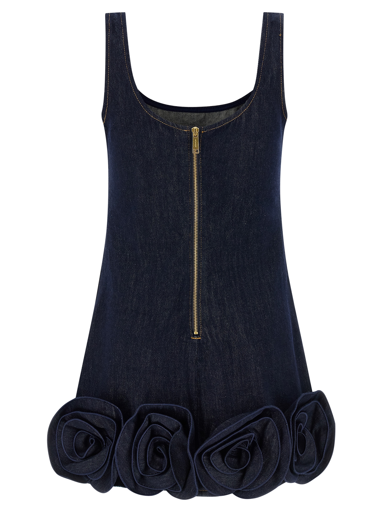 ‘Indigo Denim 3D Flower Mini’ sleeveless dress in cotton denim with contrast stitching, wide round neckline at the front, back zip closure, and 3D floral details at the hem.
