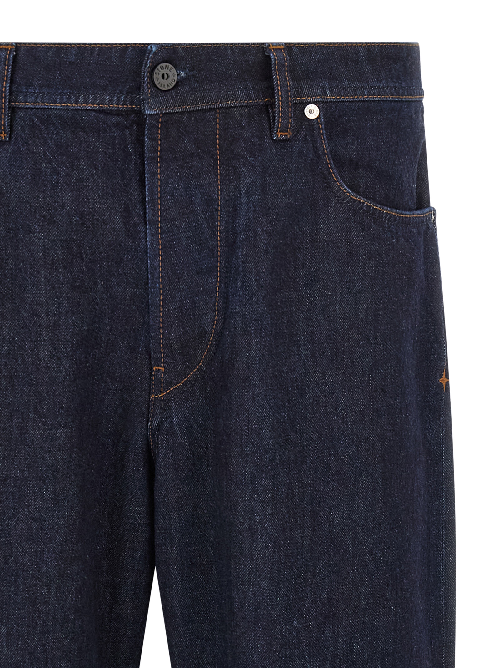 ‘Indigo Denim-Rinsed’ jeans in garment-dyed cotton denim with contrast stitching, straight leg, front button closure, five pockets, logo badge applied at the back.