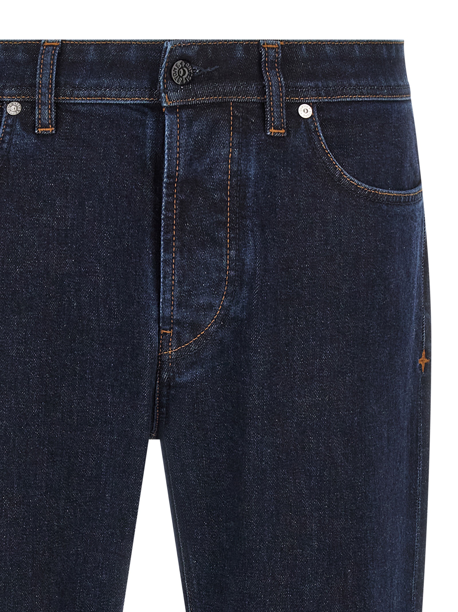 ‘Indigo Denim-Rinsed’ jeans in garment-dyed cotton denim with contrast stitching, straight leg, front button closure, five pockets, logo badge applied at the back.